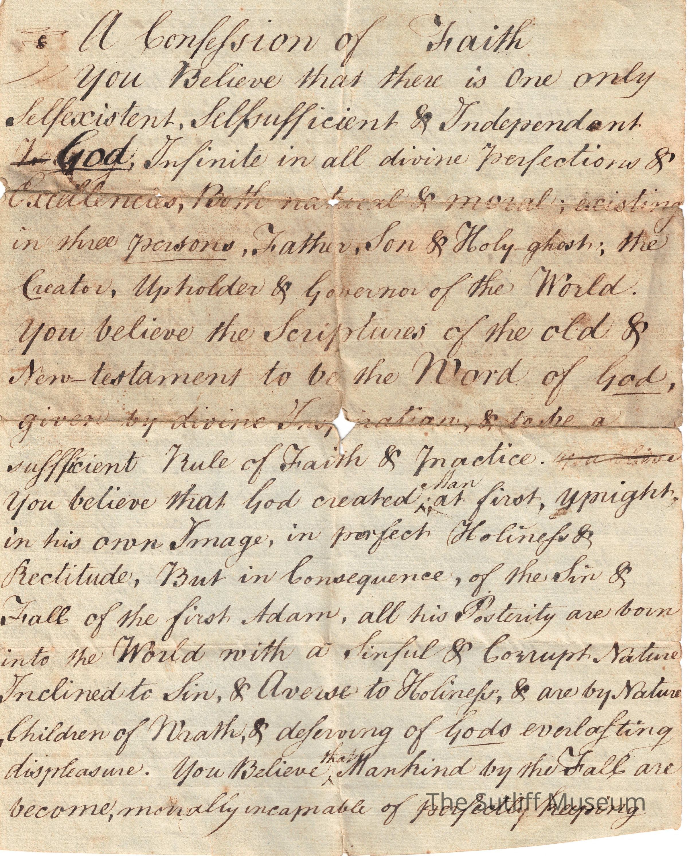 A document labeled "A Confession of Faith" written by Unknown regarding religious beliefs.