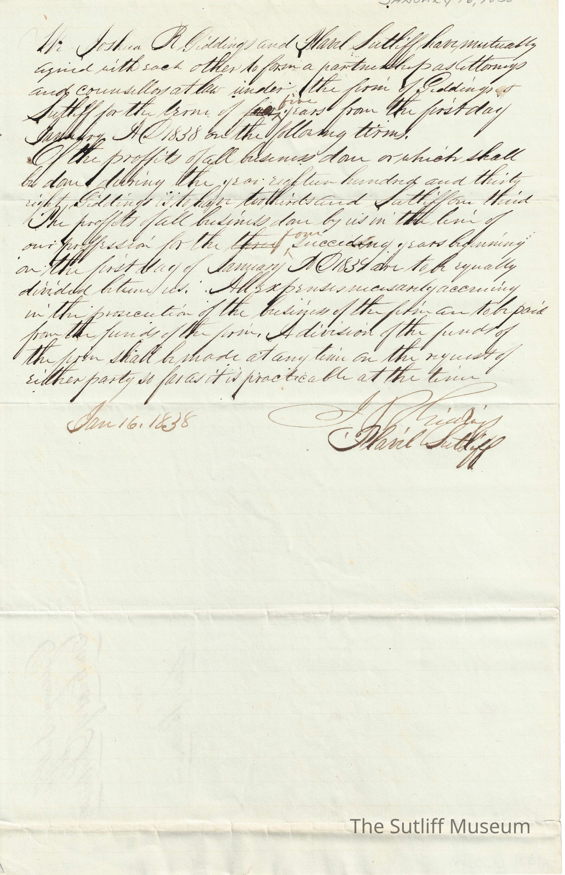 A contract between Joshua Reed Giddings and Flavel Sutliff to enter into business together as attorneys under the name Giddings and Sutliff and the conditions.Collection