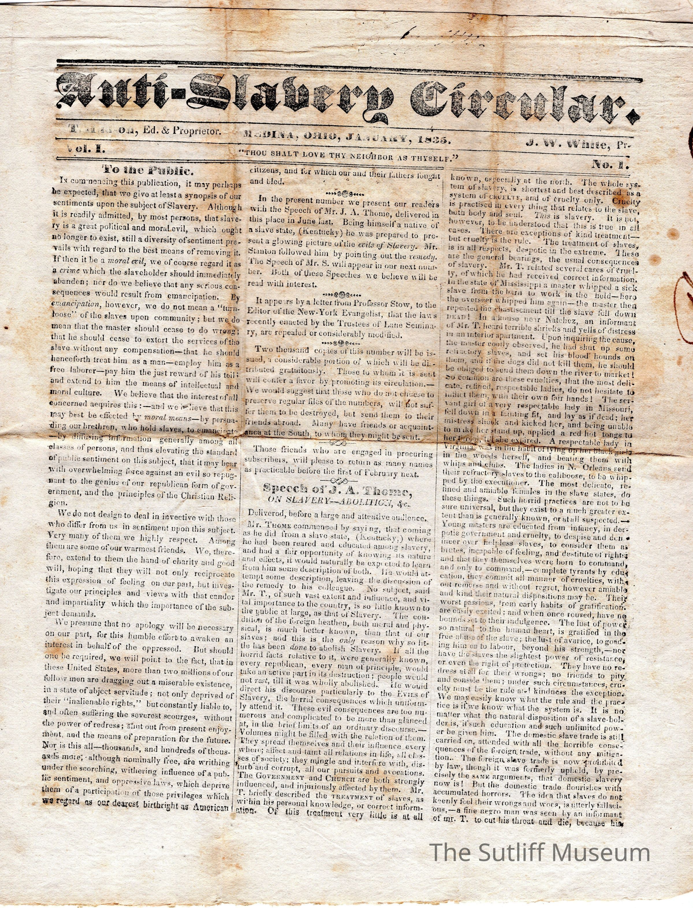 A newspaper titled "Anti-Slavery Circular" from Medina, Ohio in January of 1825.