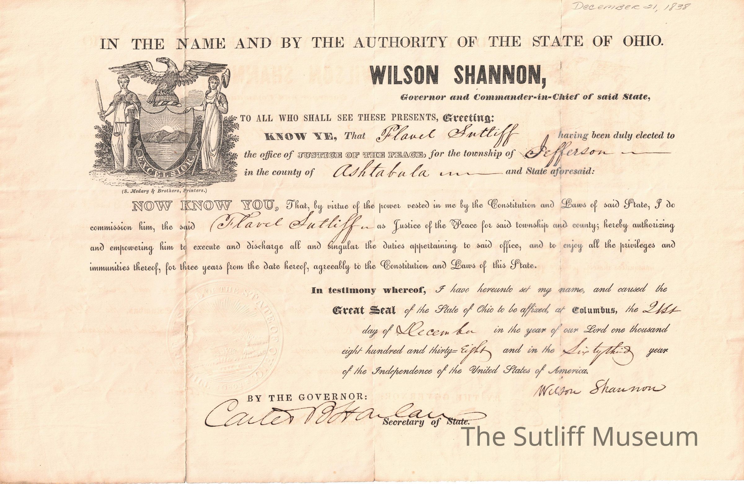 A certificate describing Flavel Sutliff being elected Justice of the Peace for Jefferson township.Collection