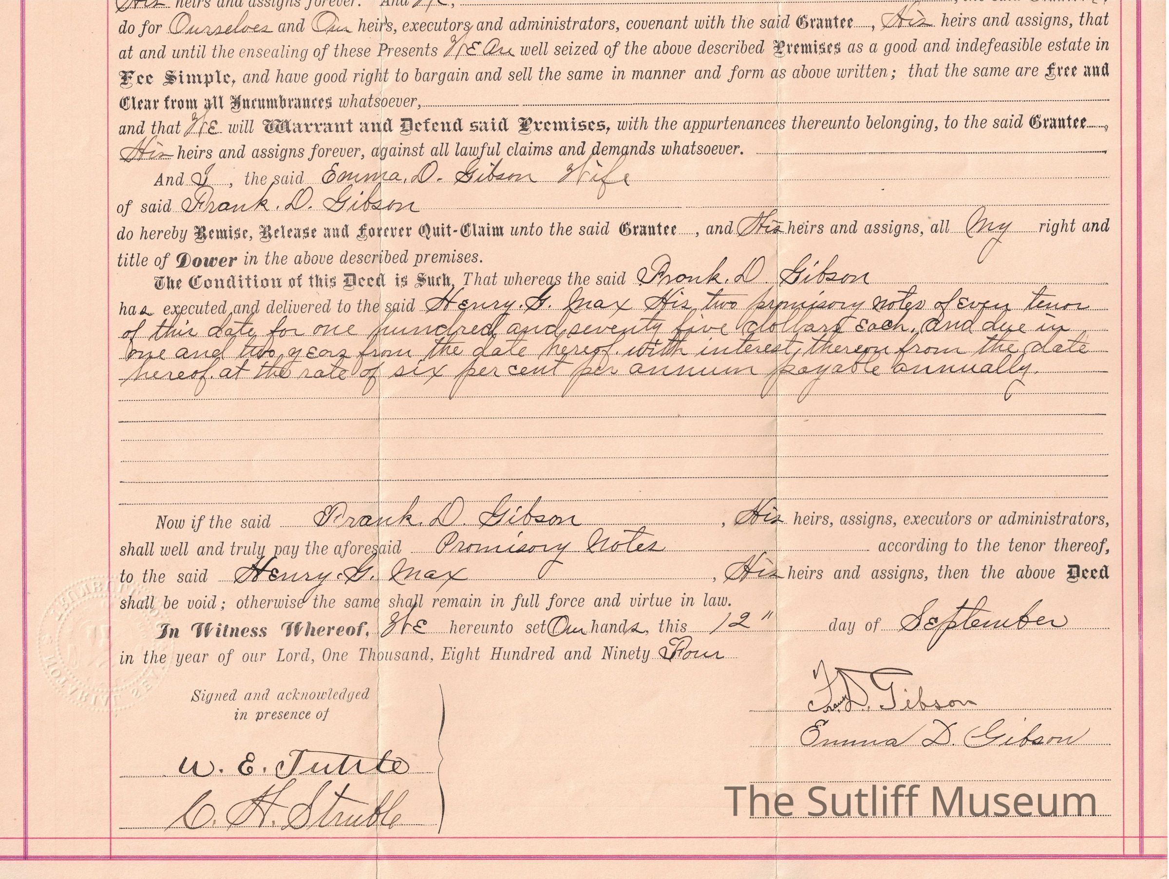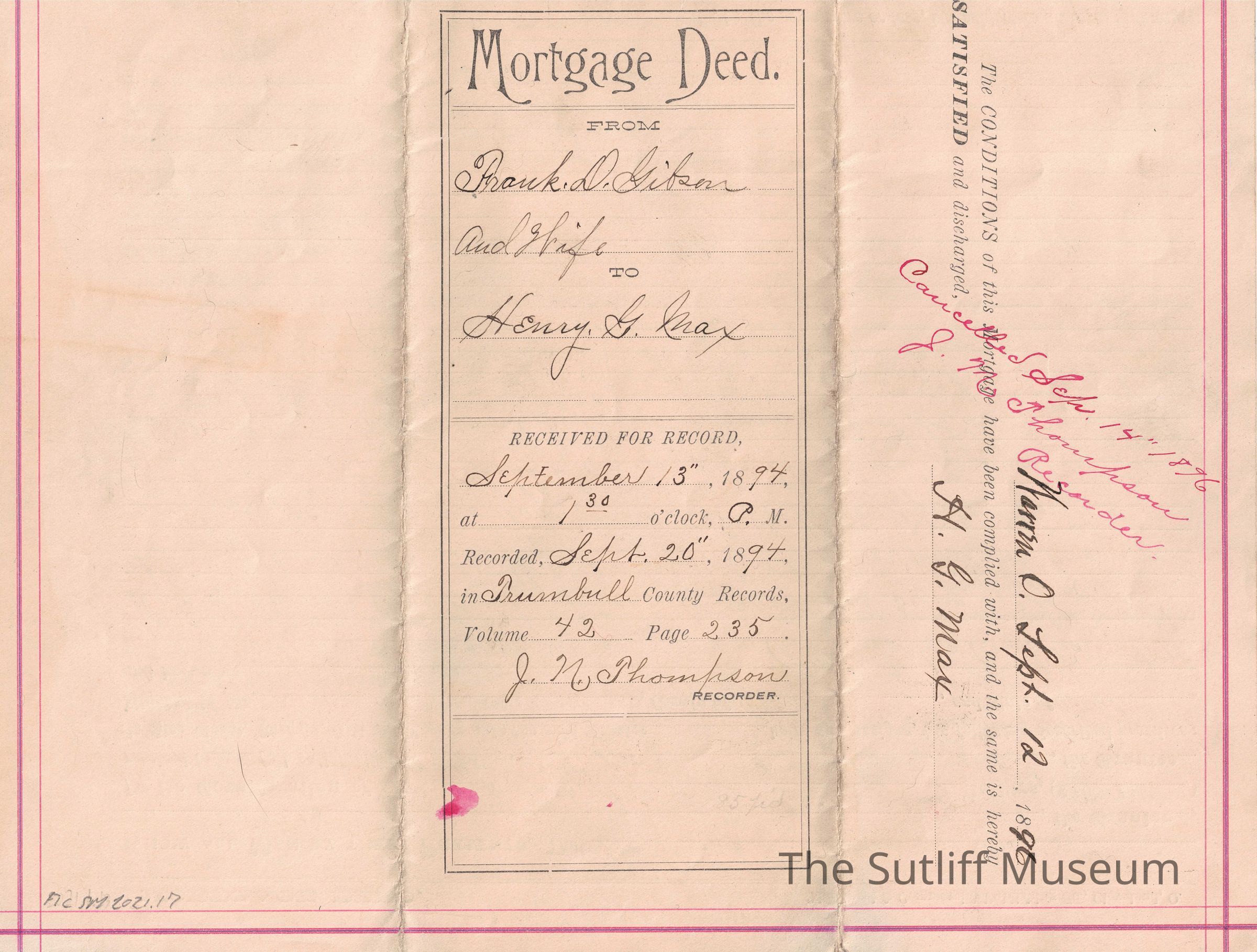 A legal document acting as a Mortgage Deed from Frank D. Gibson to Henry G. Max. It was cancelled September 14, 1896.Relationships