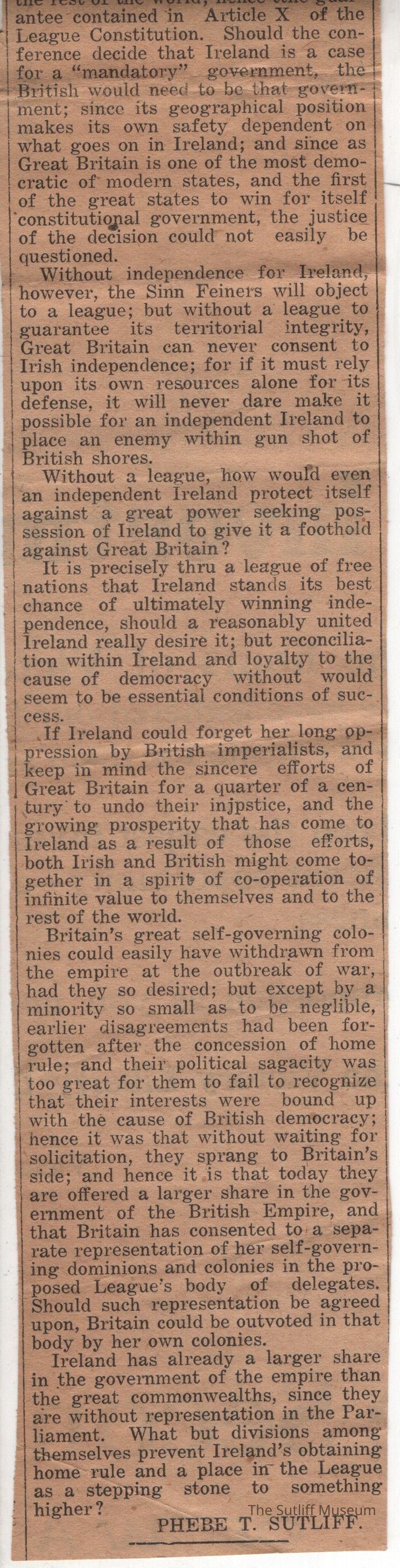 An article titled "Sin Fein And The League" by Phebe T. Sutliff. Dated 4/24/1919Collection
