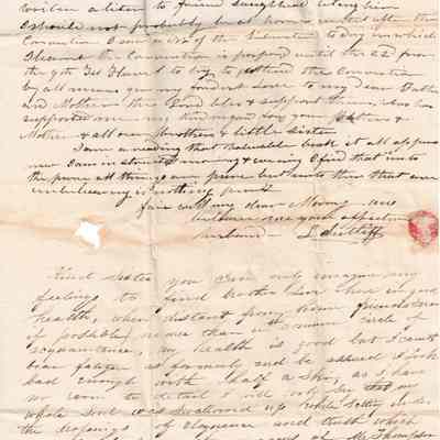 A letter from Samuel H. Sutliff to his wife Mary Plumb Sutliff regarding updates on his travels.