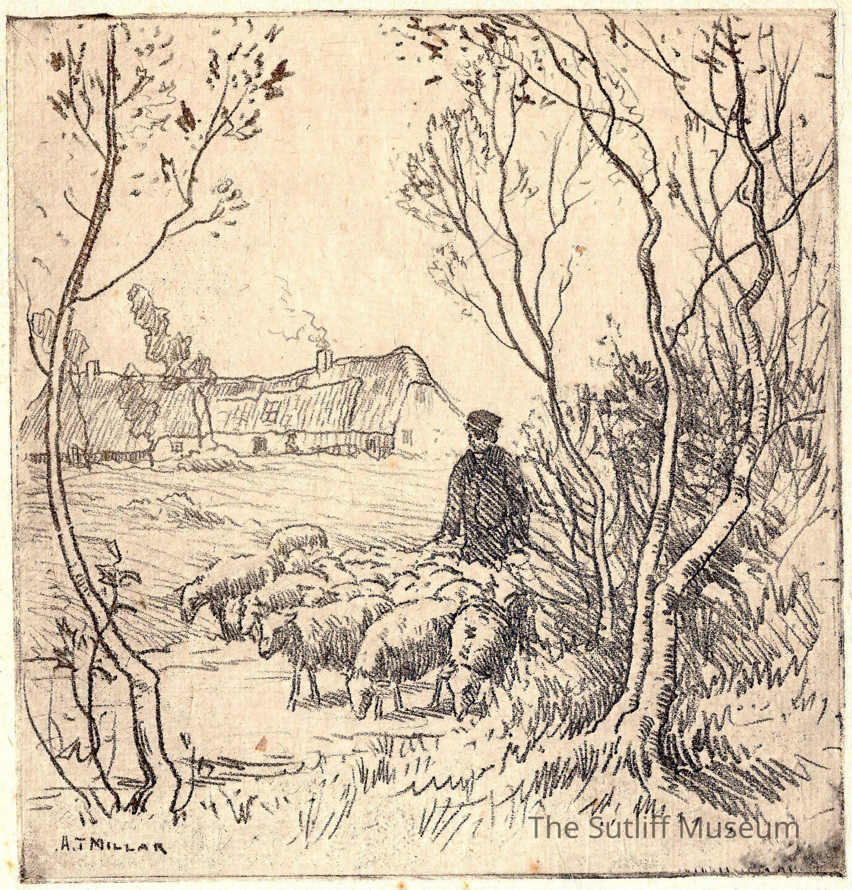 Untitled drawing by A. T. Millar. Drawing is undated. Drawing depicts a man with a herd of sheep beside small trees with a barn in the background.Lexicon