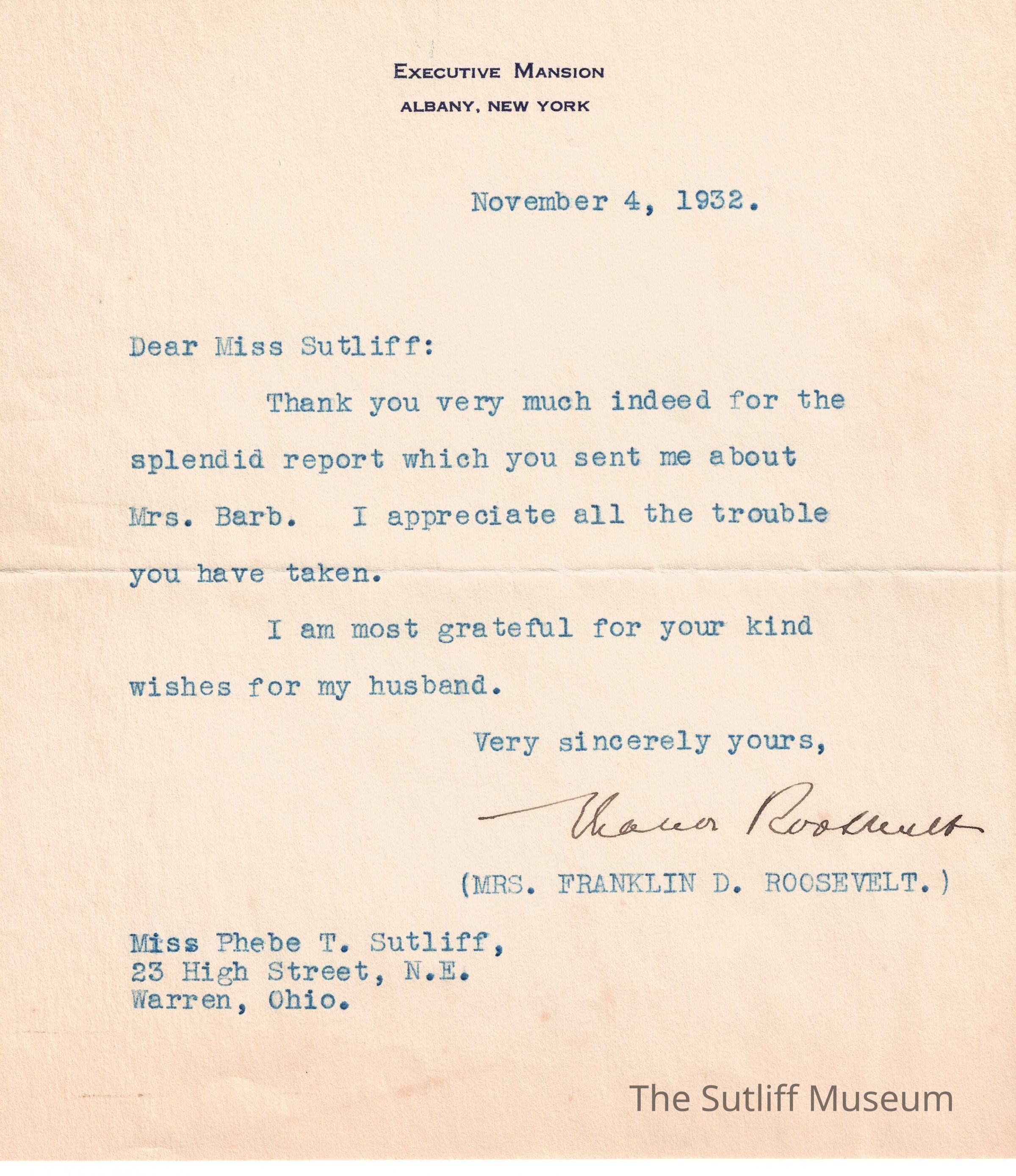 A letter from Eleanor Roosevelt to Phebe T. Sutliff regarding a report she did.Archive Details
