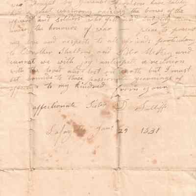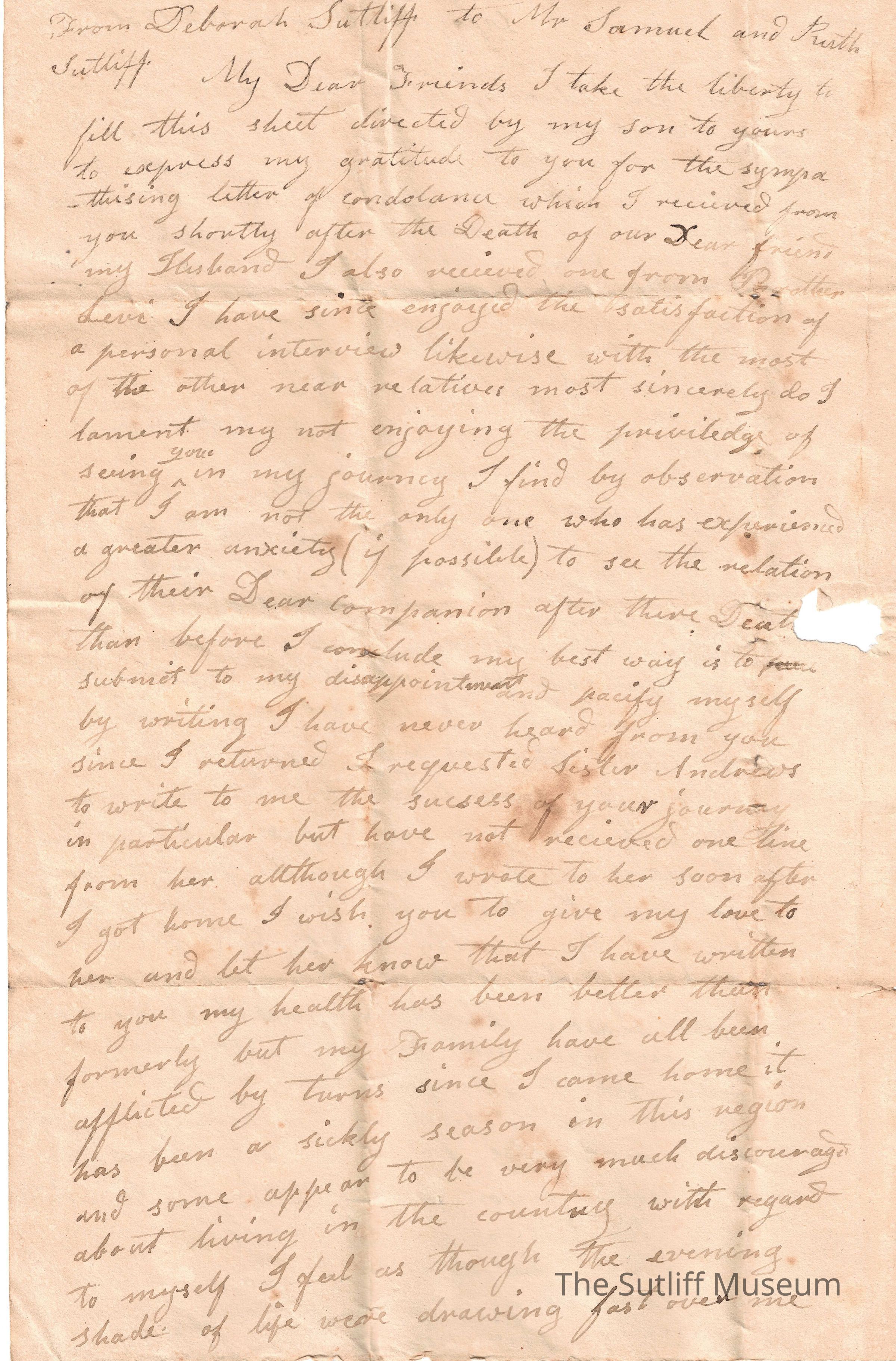 A letter from Deborah Sutliff to Samuel and Ruth Sutliff expressing gratitude for their condolences on the death of her husband, how she is doing in his absence, and mentions the Battle of Tippecanoe.Relationships