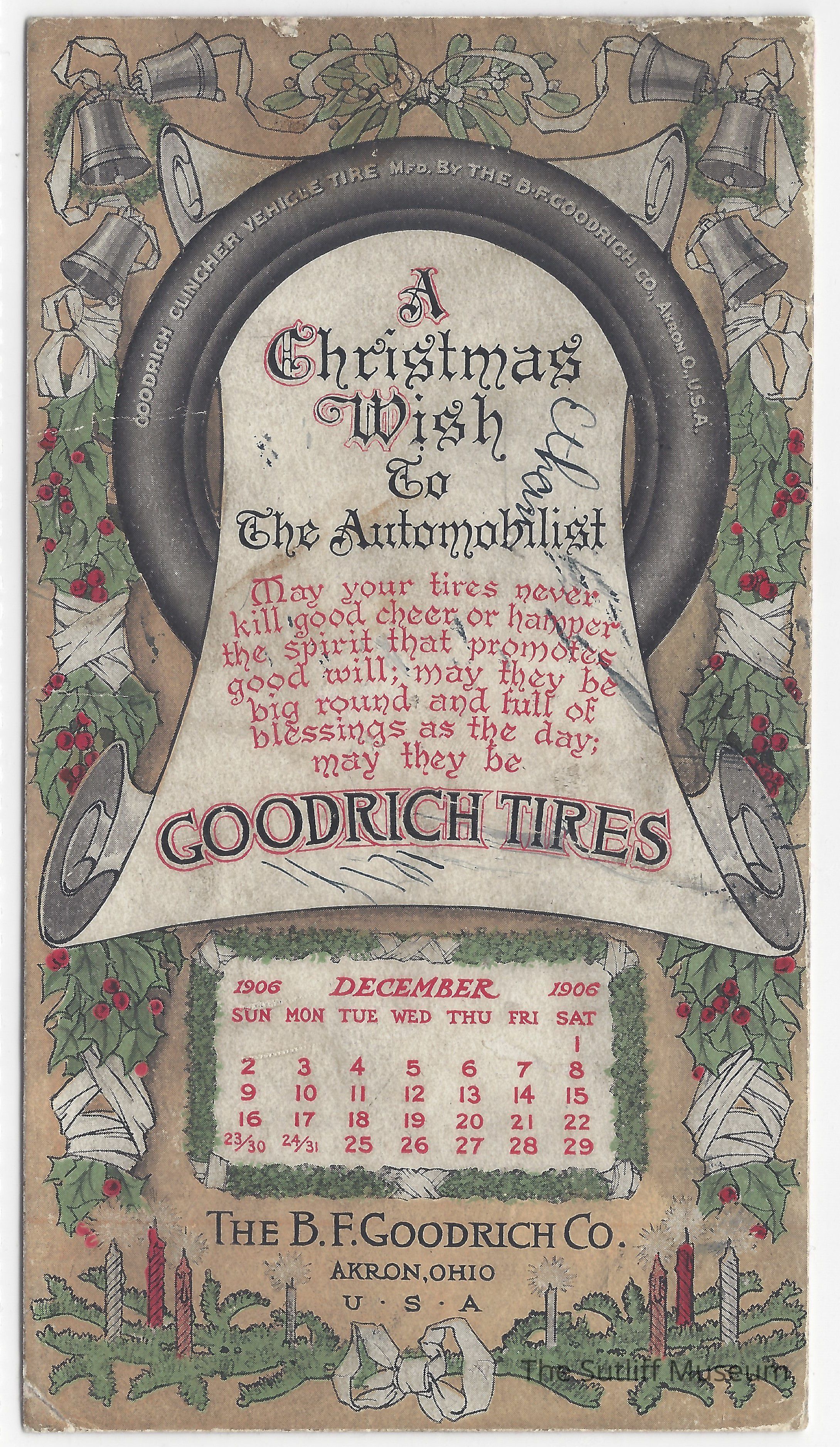 Christmas postcard depicting a tire, scroll, bells, and a calendar for December. From Goodrich Tires and the B.F. Goodrich Co.