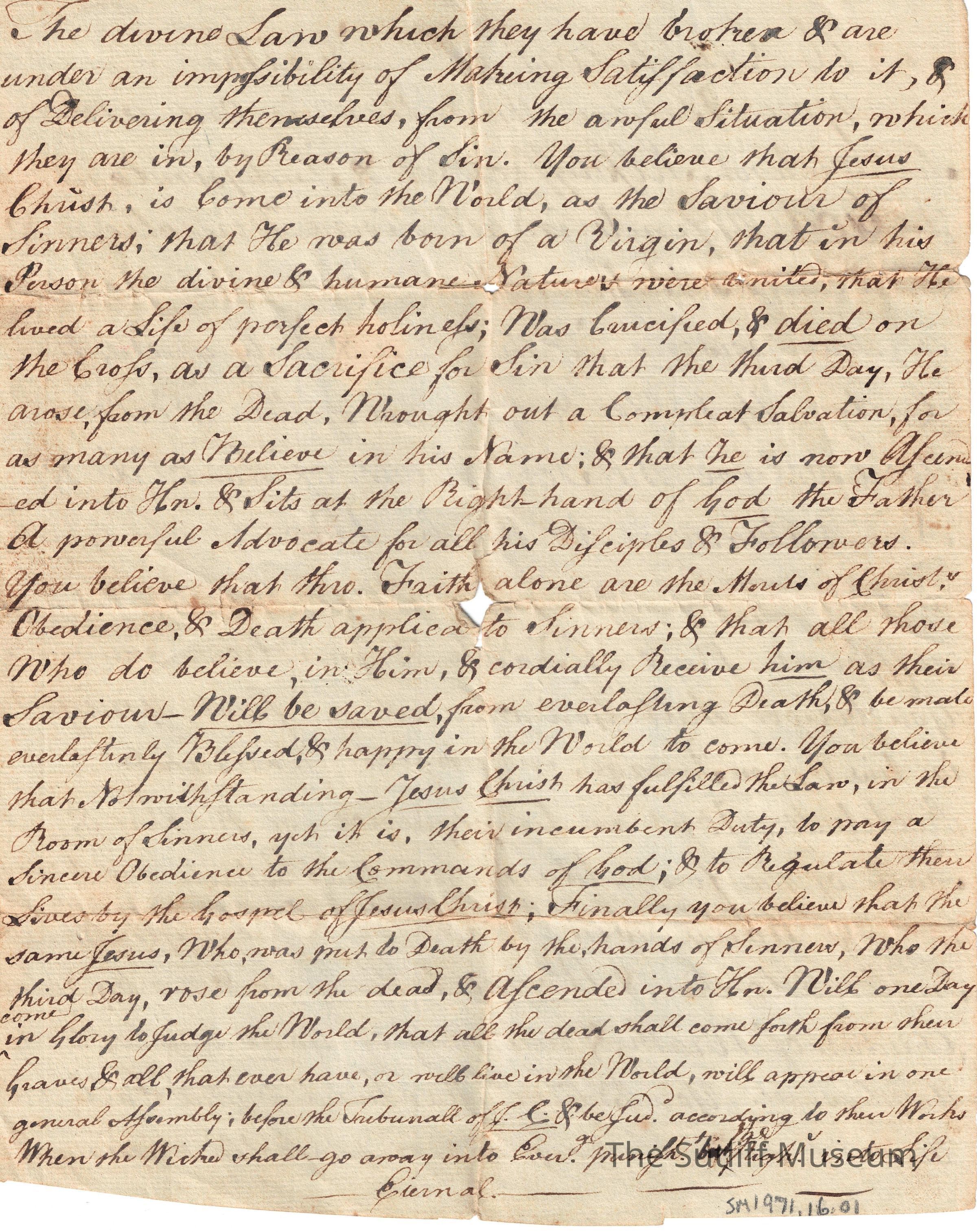 A document labeled "A Confession of Faith" written by Unknown regarding religious beliefs.