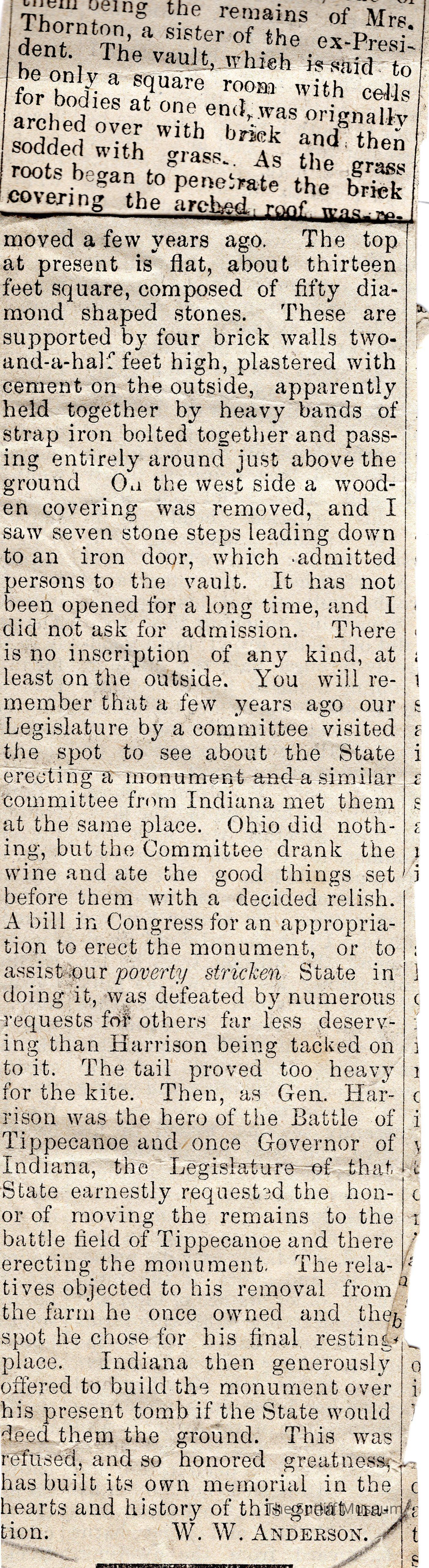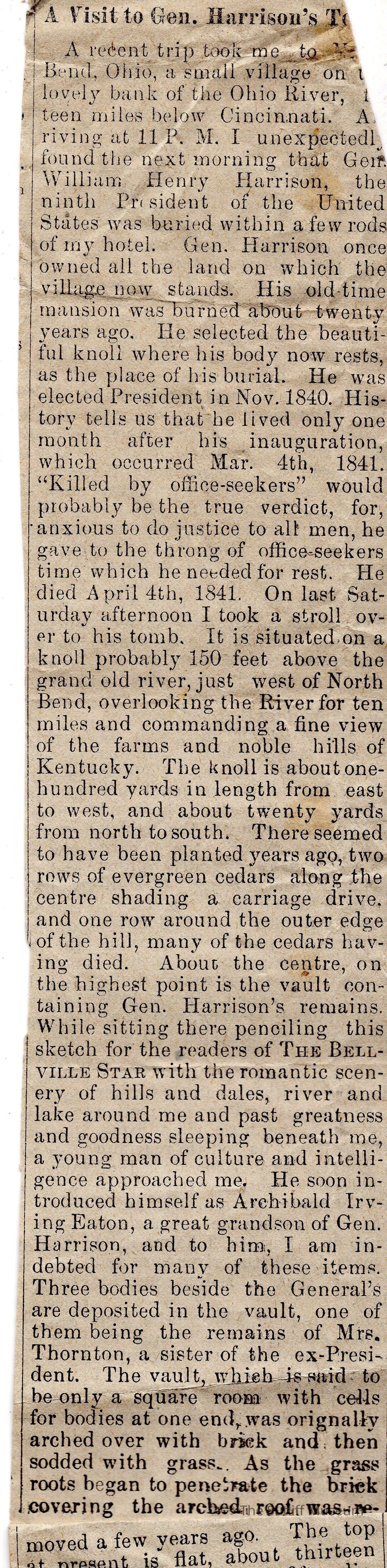 Newspaper clipping with an article titled "A Visit to Gen. Harrison's Tomb"Collection
