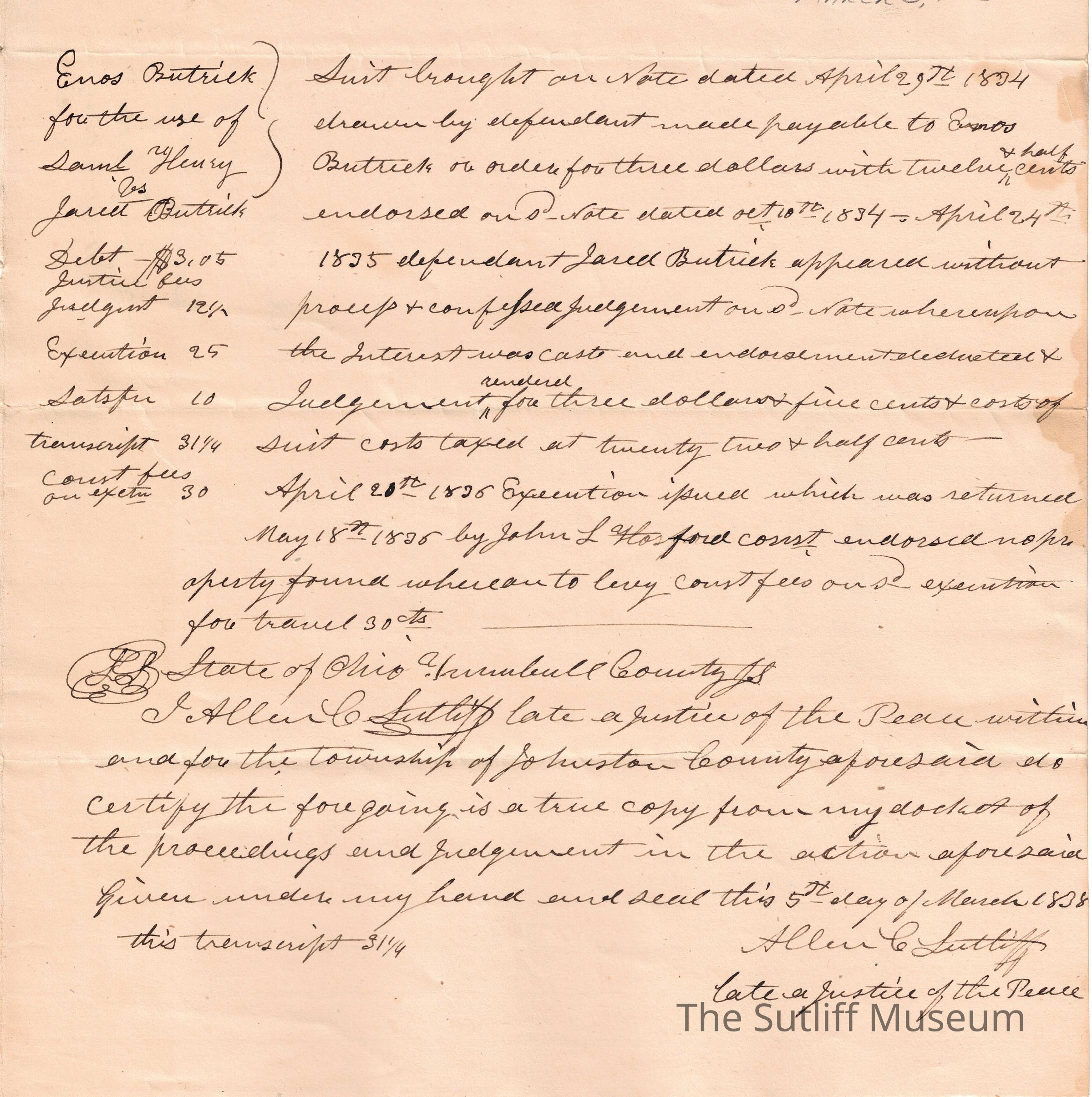 A letter from Allen Curtis Sutliff to Enos Butrick for the use of Samuel Henry vs Janice Butrick.