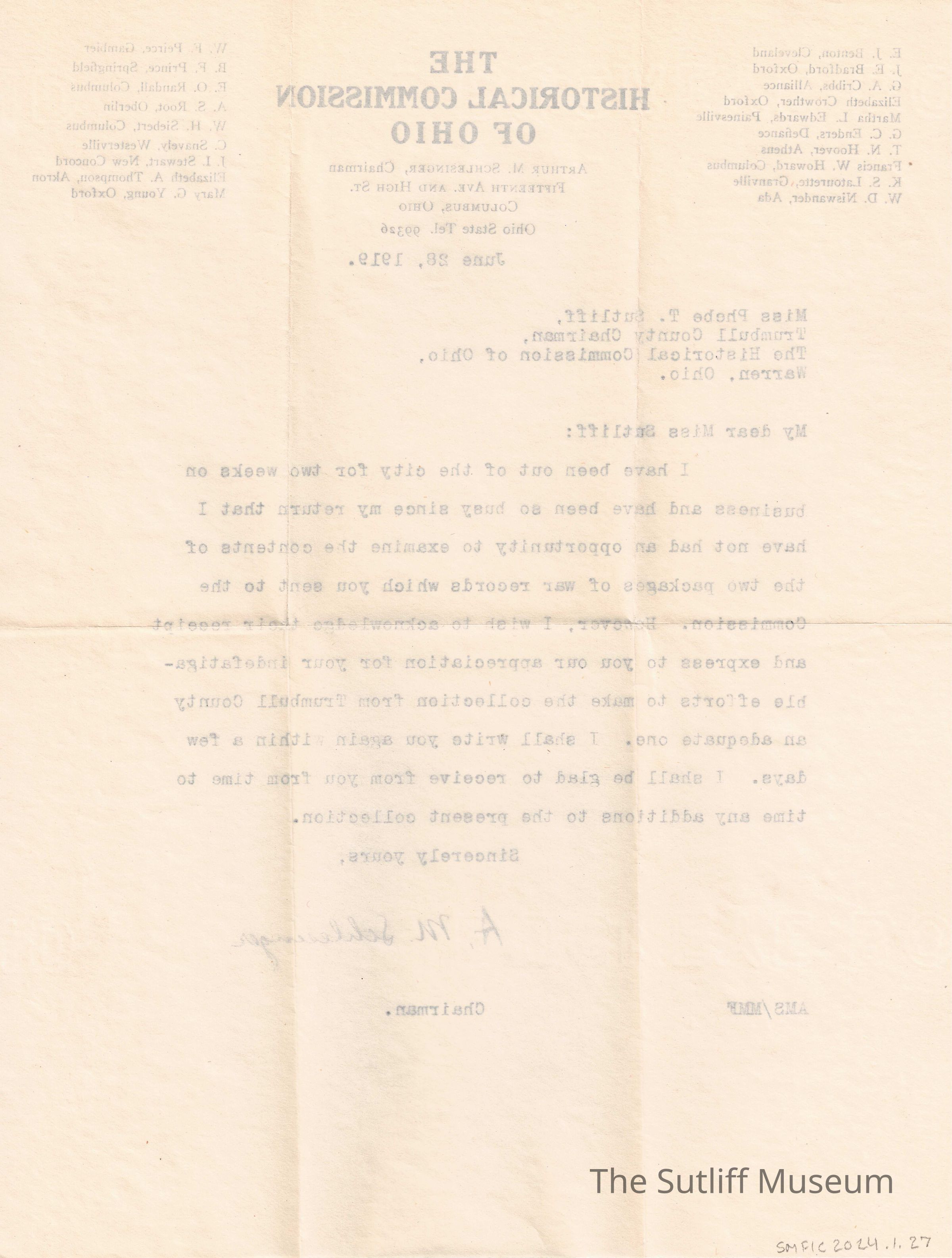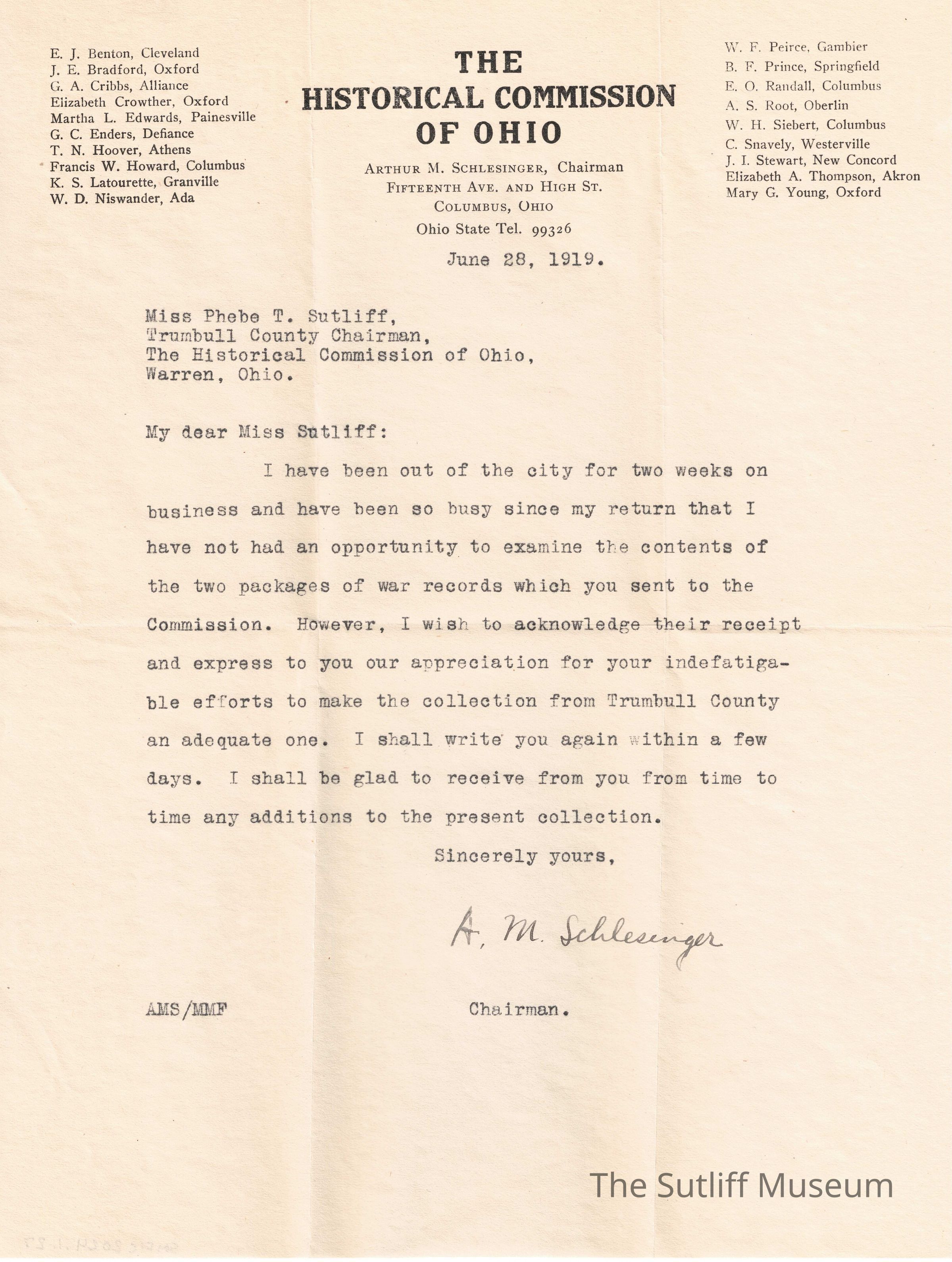 A letter from Arthur M. Schlesinger, the chairman of the Historical Commission of Ohio, to Phebe T Sutliff regarding the war records she sent to be examined.Relationships