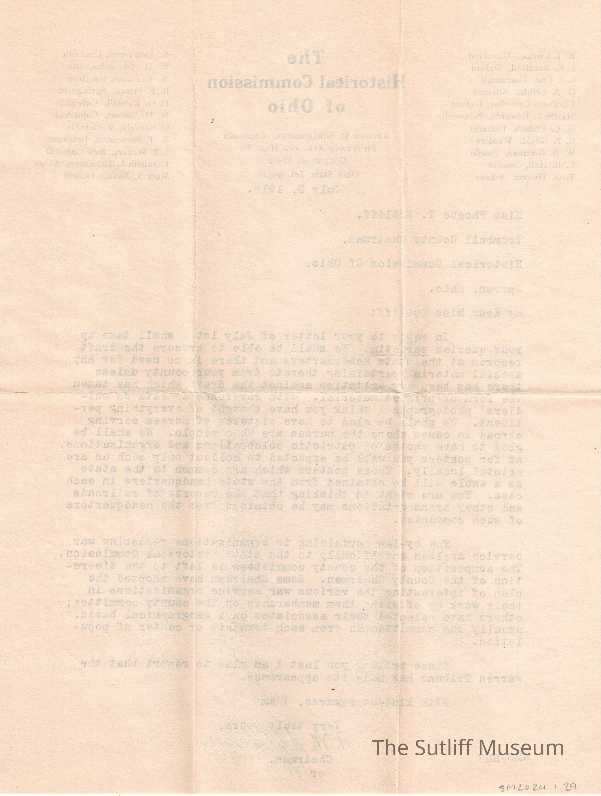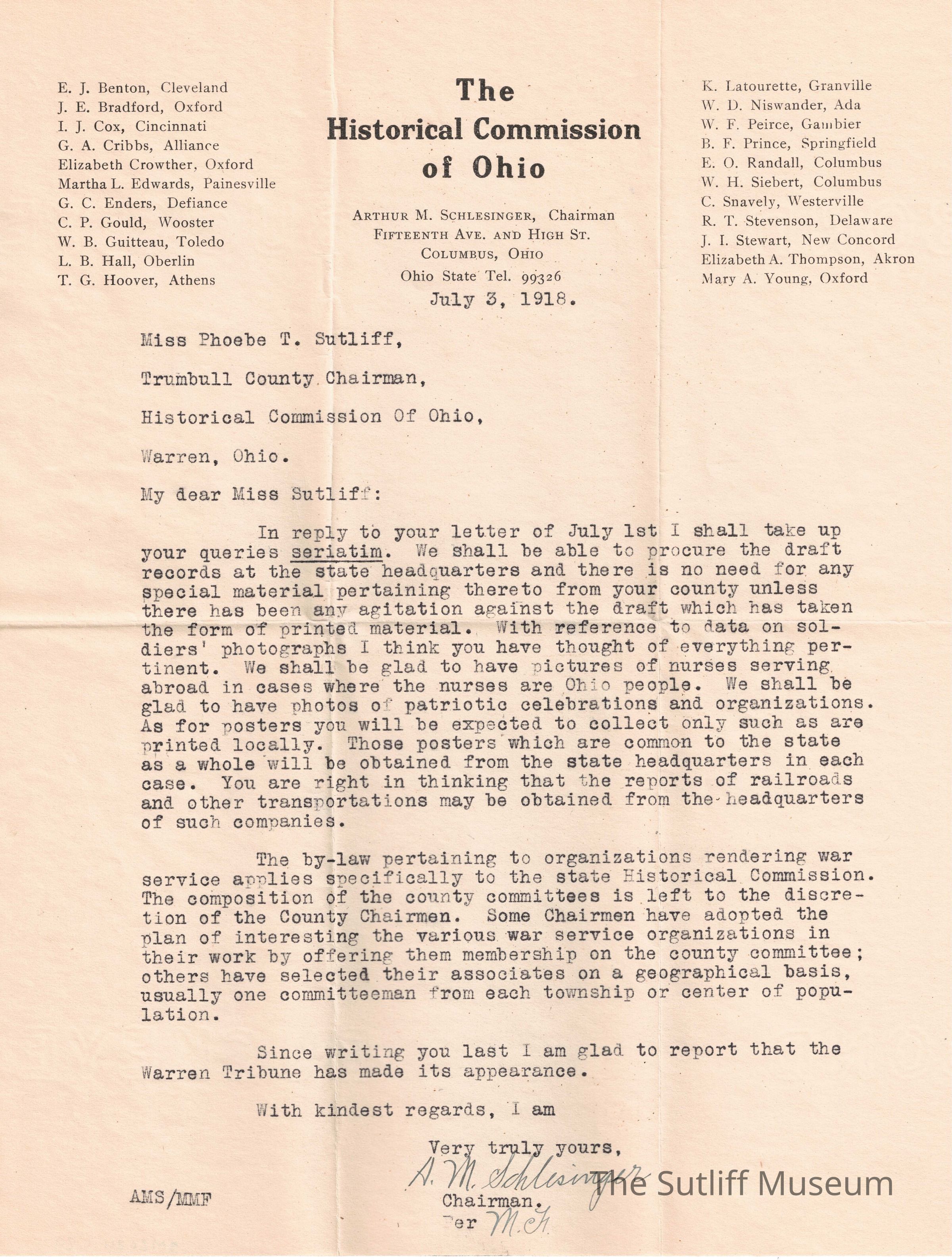 A letter from Arthur M. Schlesinger, the chairman of the Historical Commission of Ohio, to Phebe T Sutliff regarding soldier photographs, posters, and how a by-law applies.Relationships