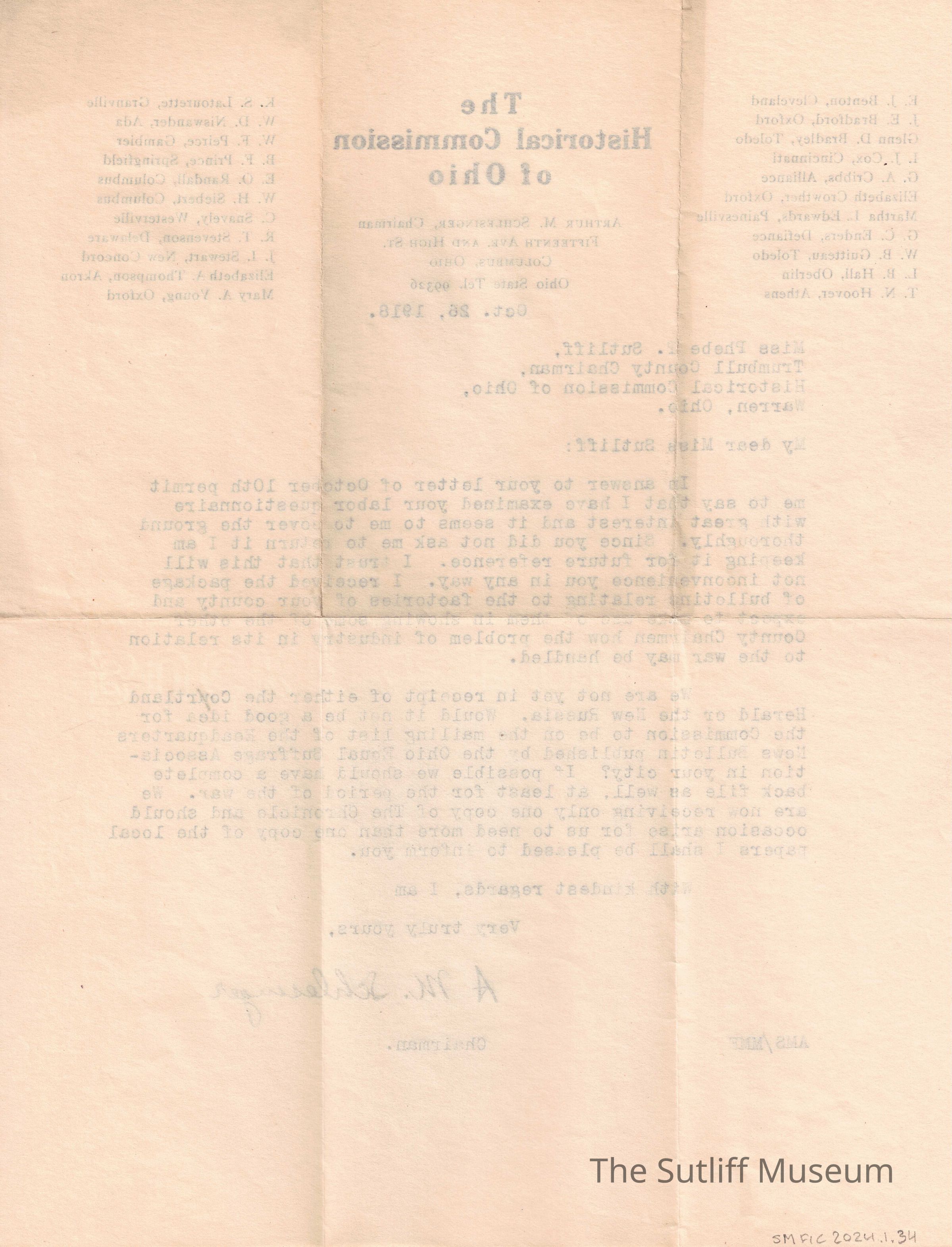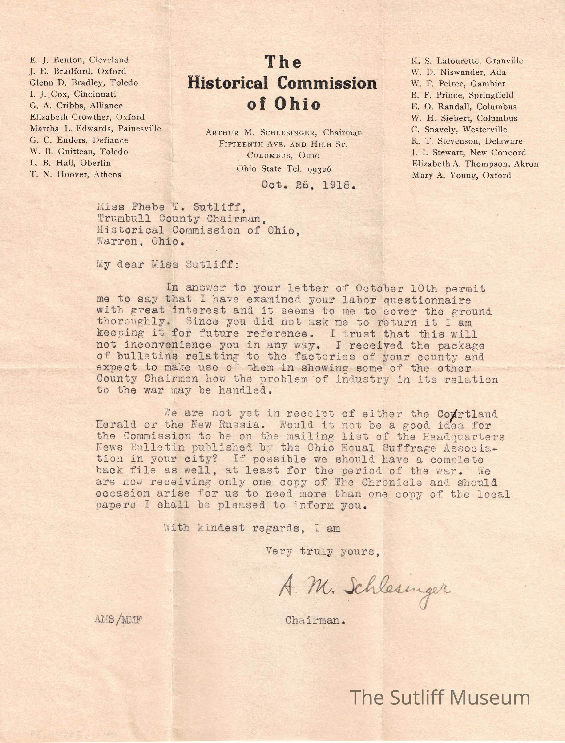 A letter from Arthur M. Schlesinger, the chairman of the Historical Commission of Ohio, to Phebe T Sutliff regarding her labor questionnaire and some other questions.Relationships