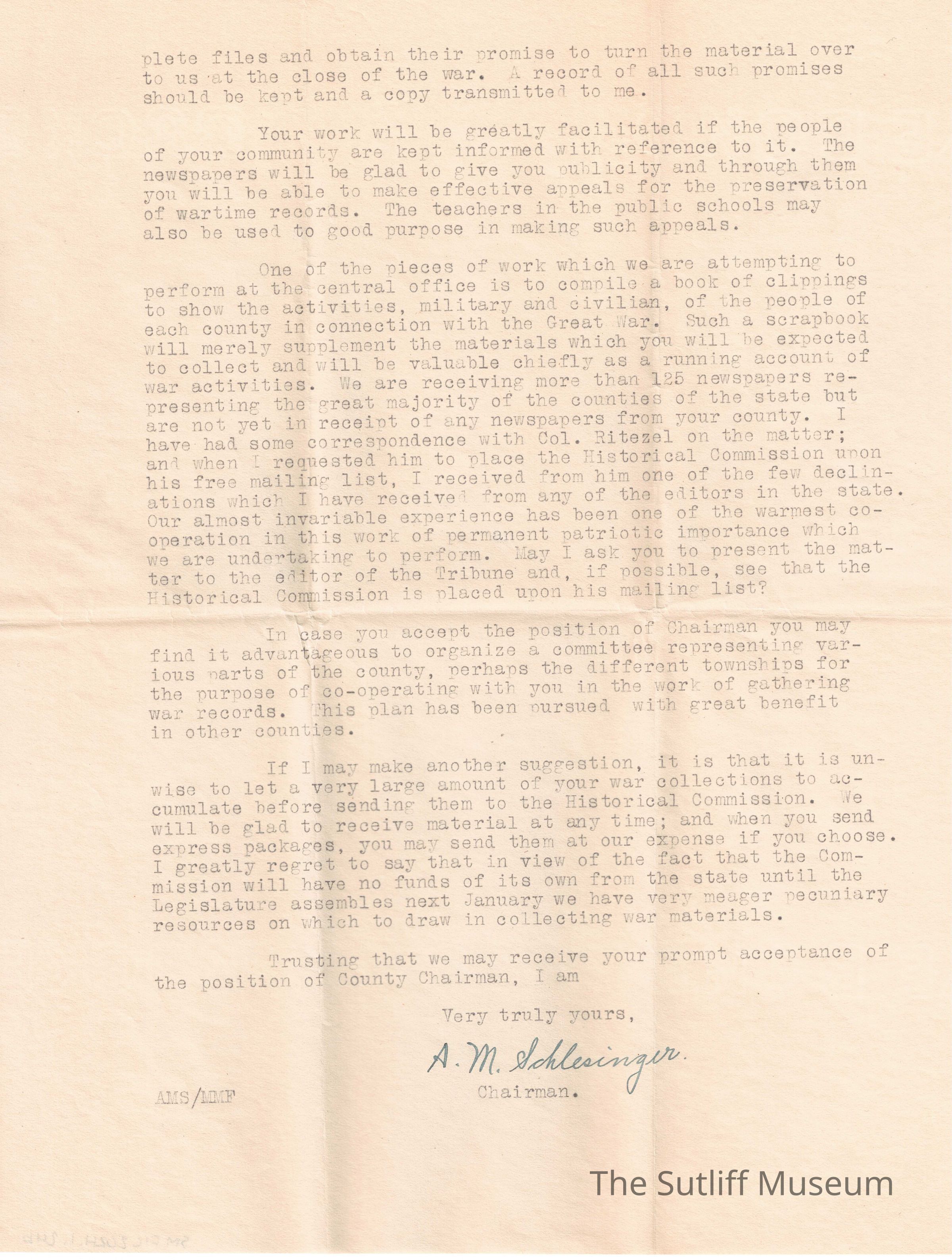 A letter from Arthur M. Schlesinger, the chairman of the Historical Commission of Ohio, to Phebe T Sutliff asking her to consider joining them in the position of Chairman of Trumbull County.Relationships