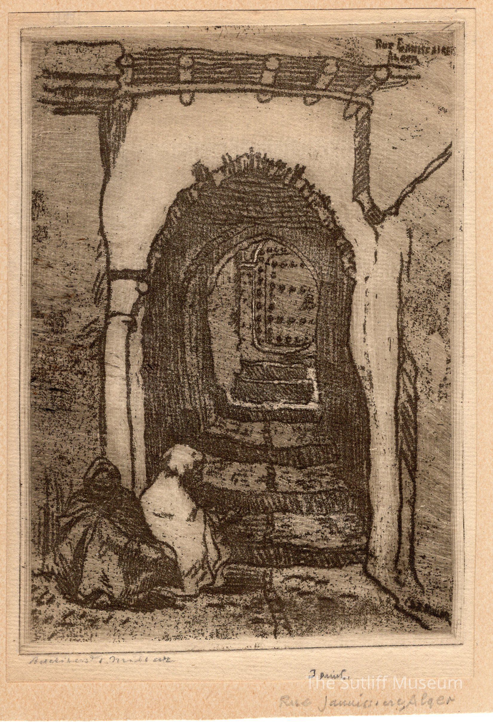 Drawing by A. T. Millar. Drawing is undated. Drawing depicts 2 cloaked figures to the left beside an arched doorway leading down an ally way.Lexicon
