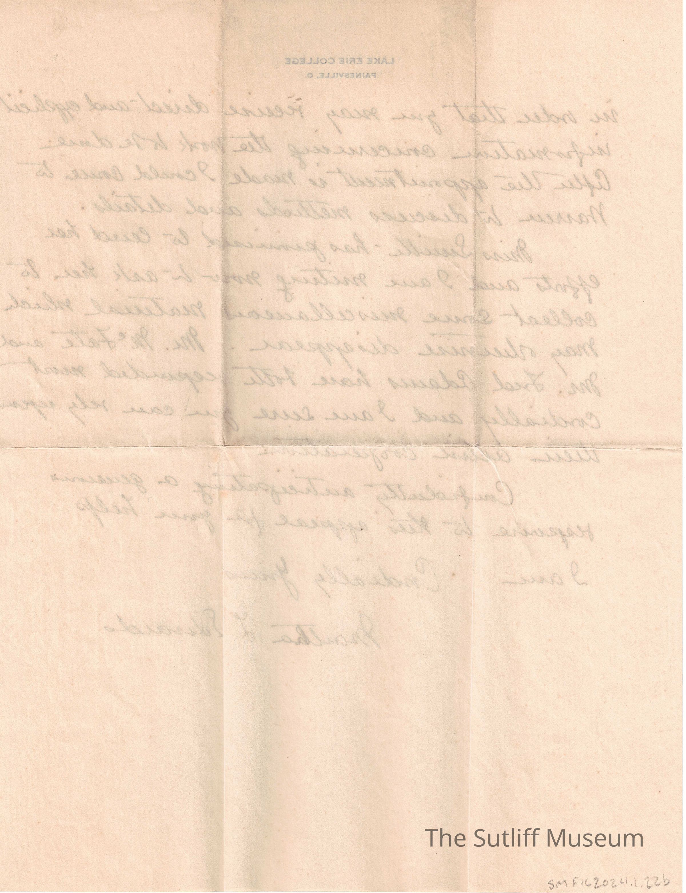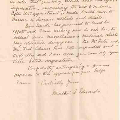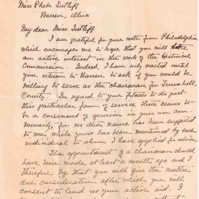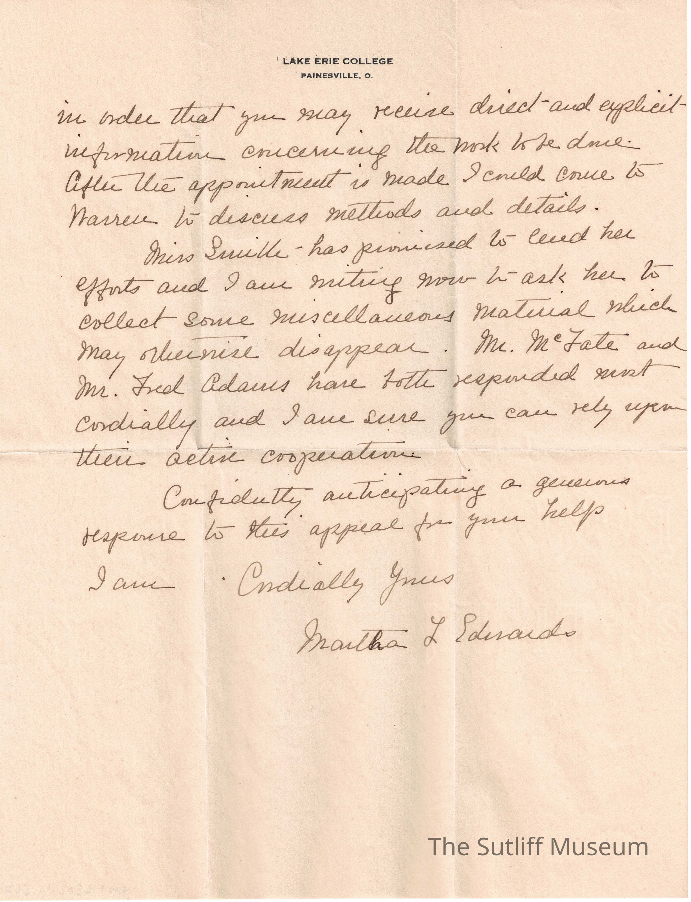 A letter from Martha L. Edwards to Phebe Temperance Sutliff asking if she'd be willing to serve as chairman for Trumbull County for the Historical Commission and the time crunch they are under.Relationships