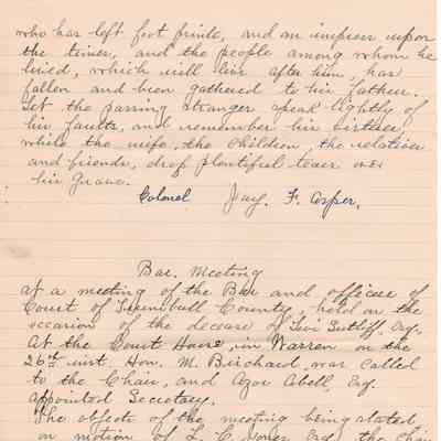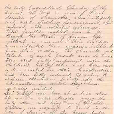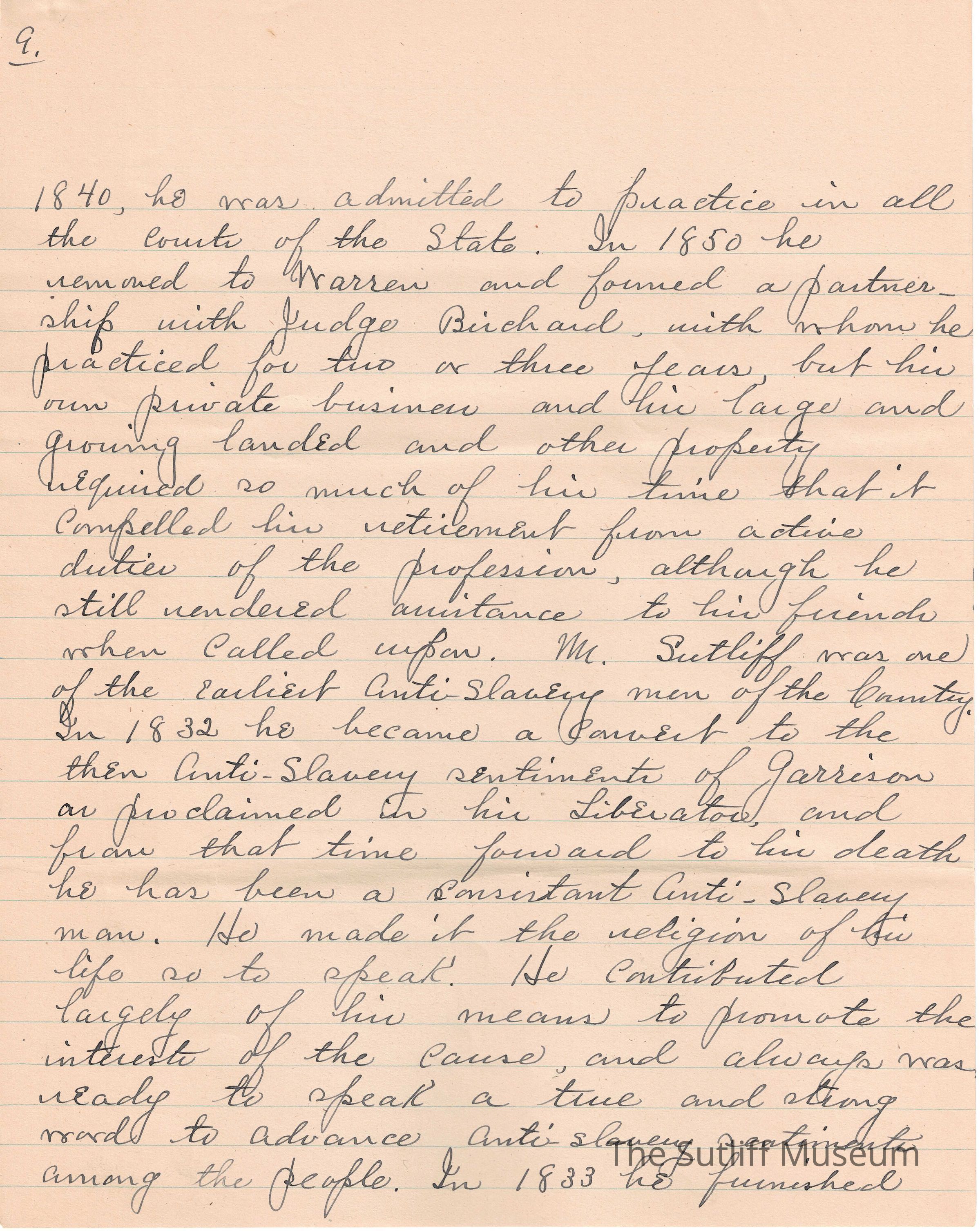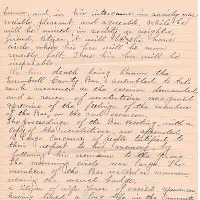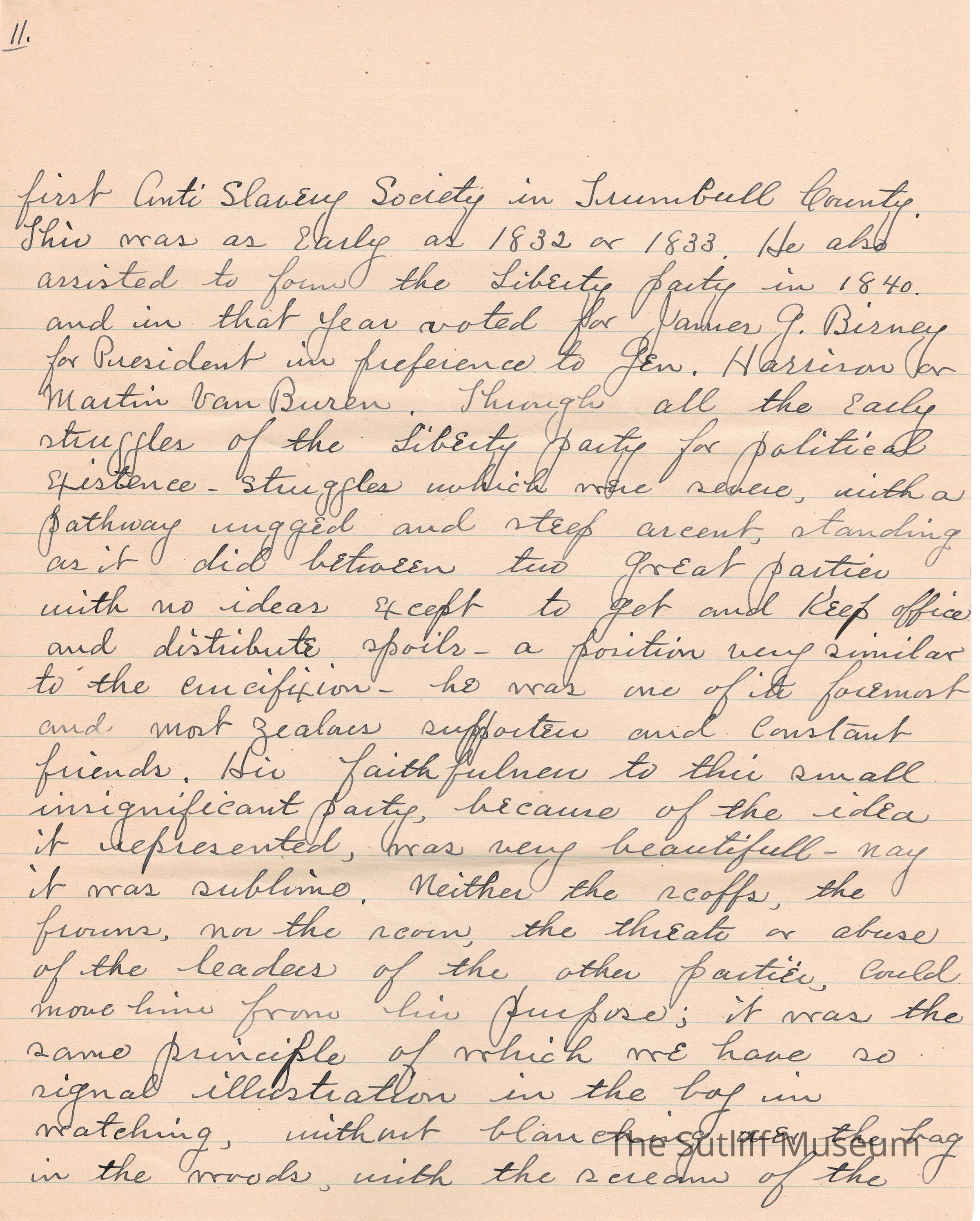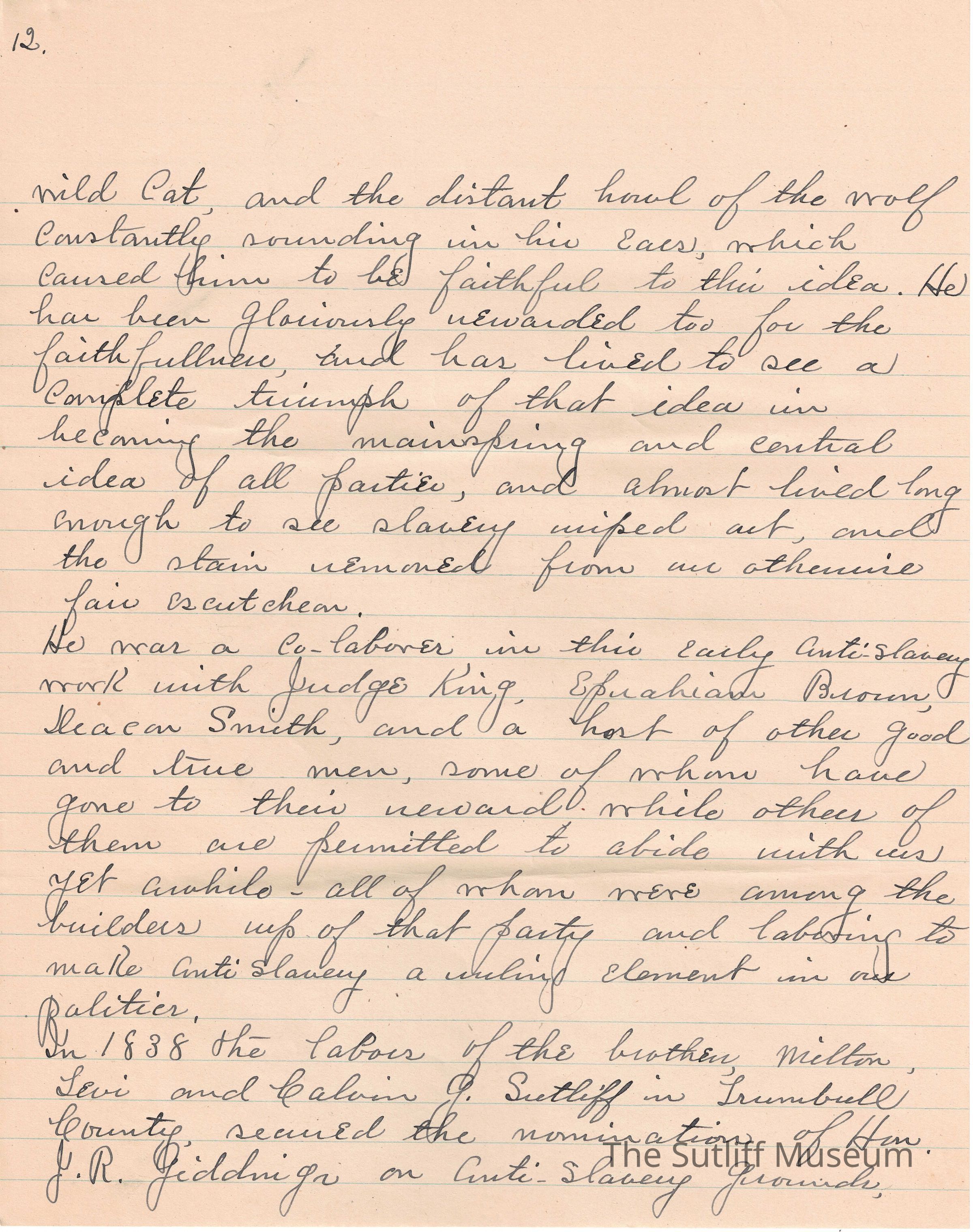 A handwritten copy of Levi Sutliff's obituary written by M. Birchard.