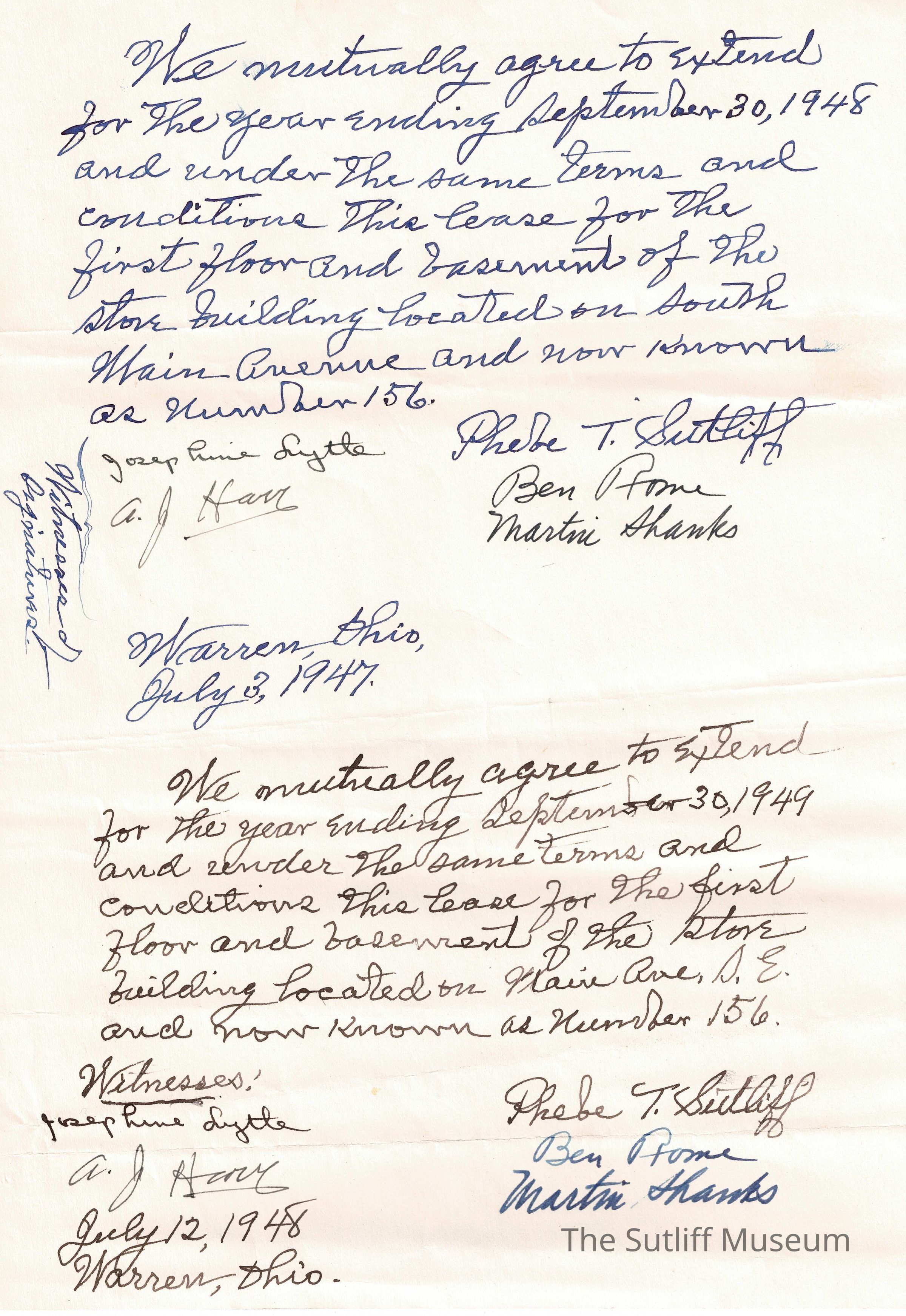 A record of extension of an Indenture of Lease agreement between Lydia Sutliff Brainard and Ben Rom and Martin Shanks for 1947.Collection