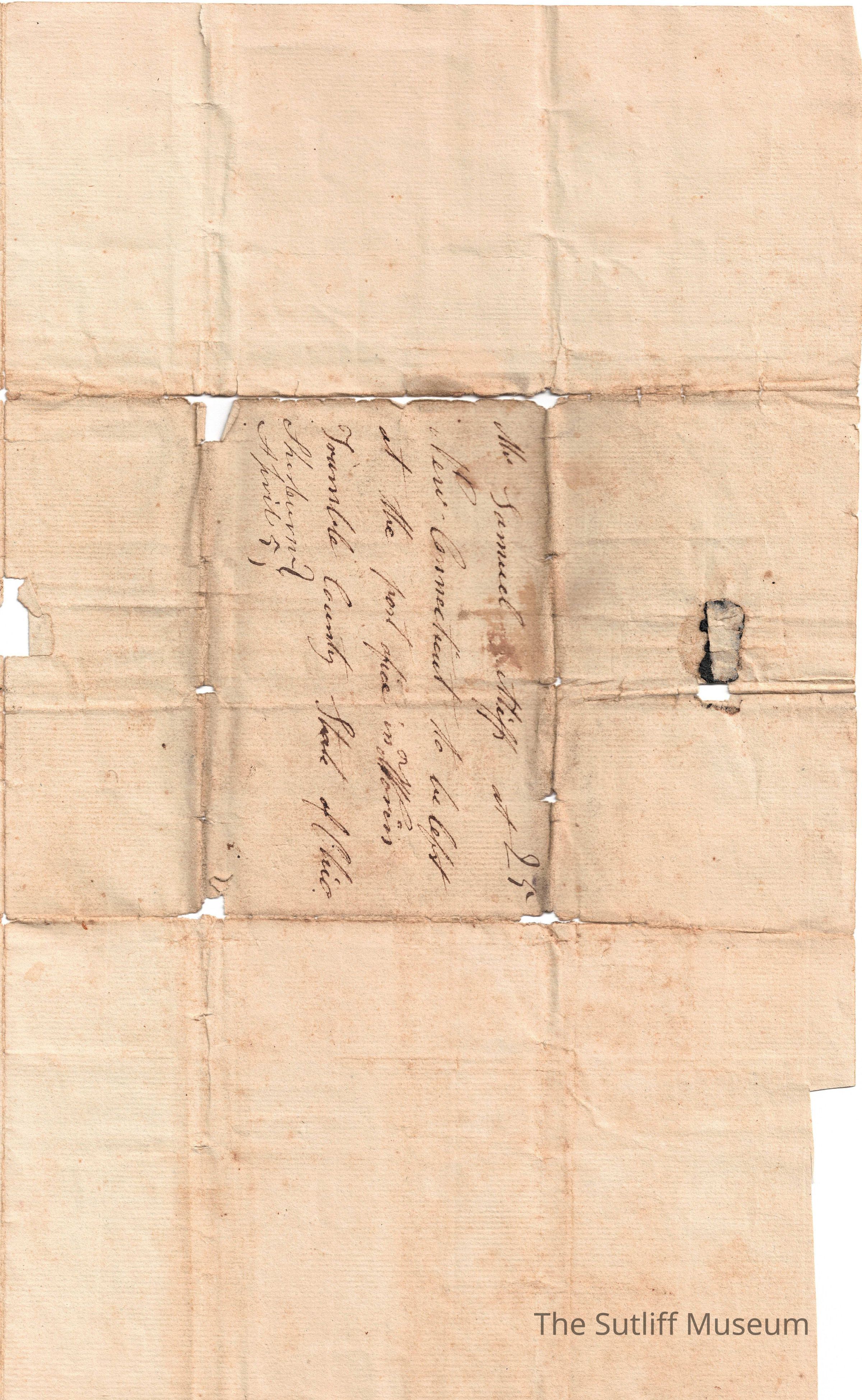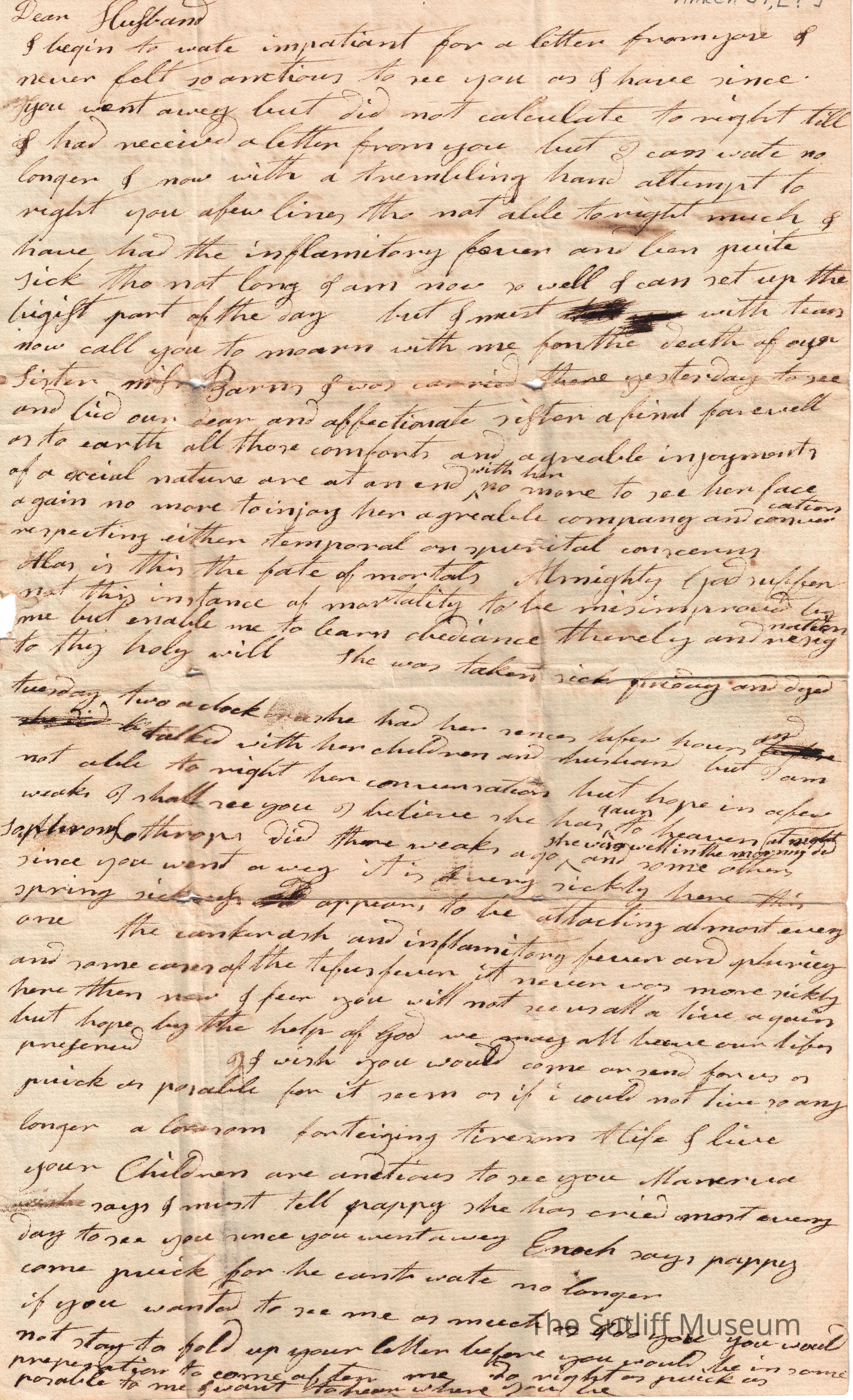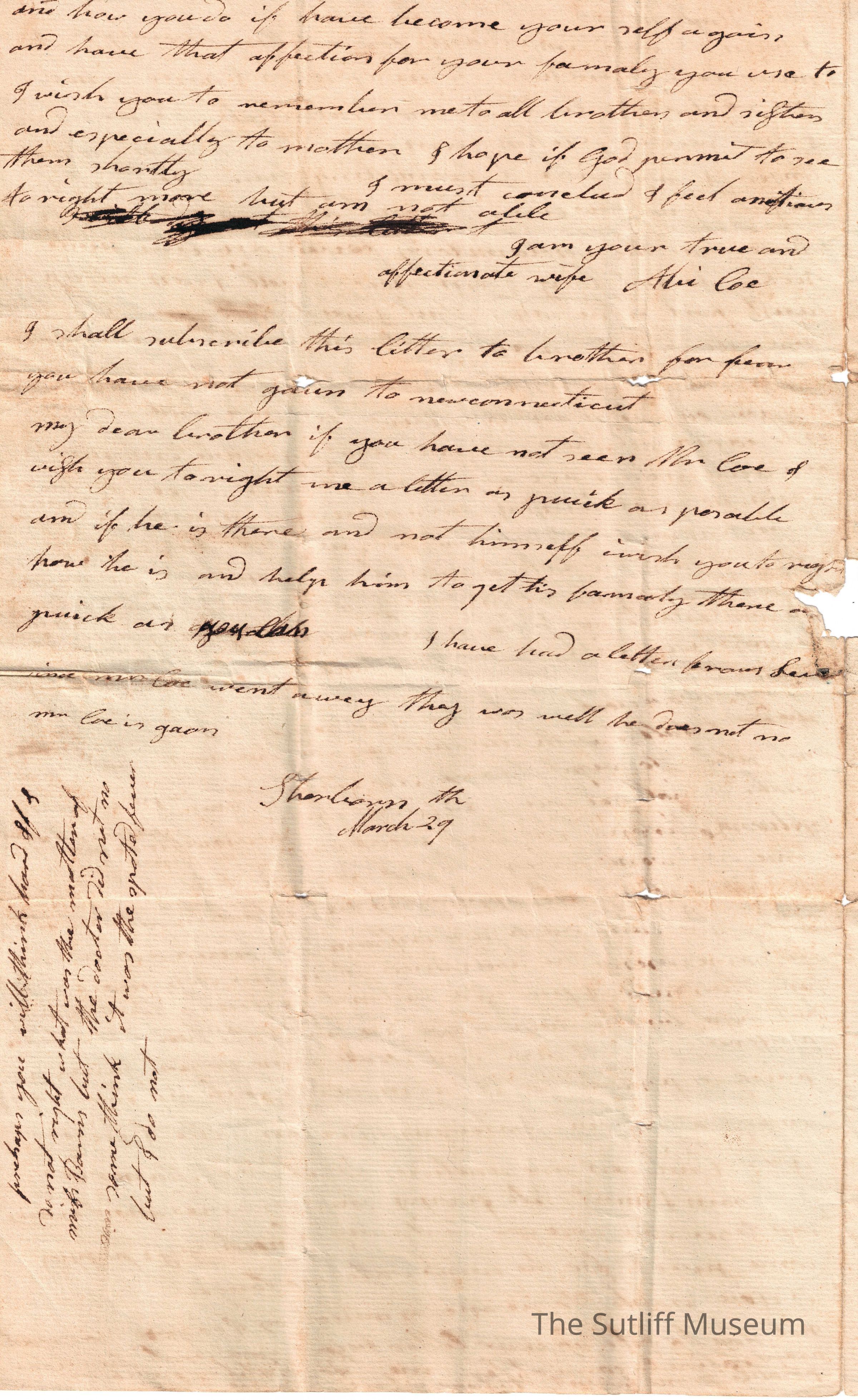 A letter from Abiah Sutliff Coe to her husband Allan Coe regarding her anxiety and sickness while he is away, the death of a sister, she is sending it to Samuel Sutliff in case he is on the move.Collection