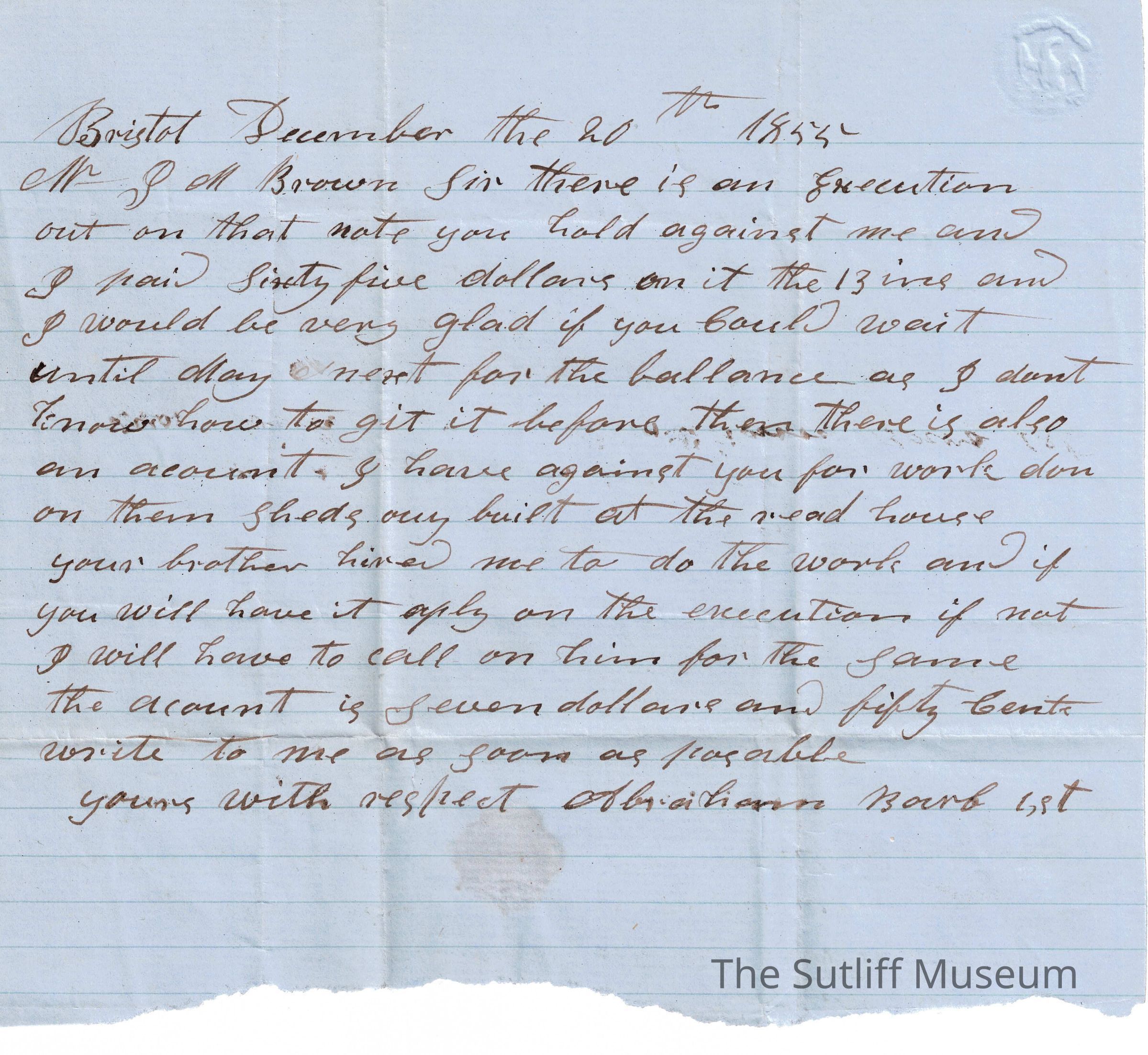 A letter to James M. Brown to Abraham Barb regarding payment on a note he sent.Relationships