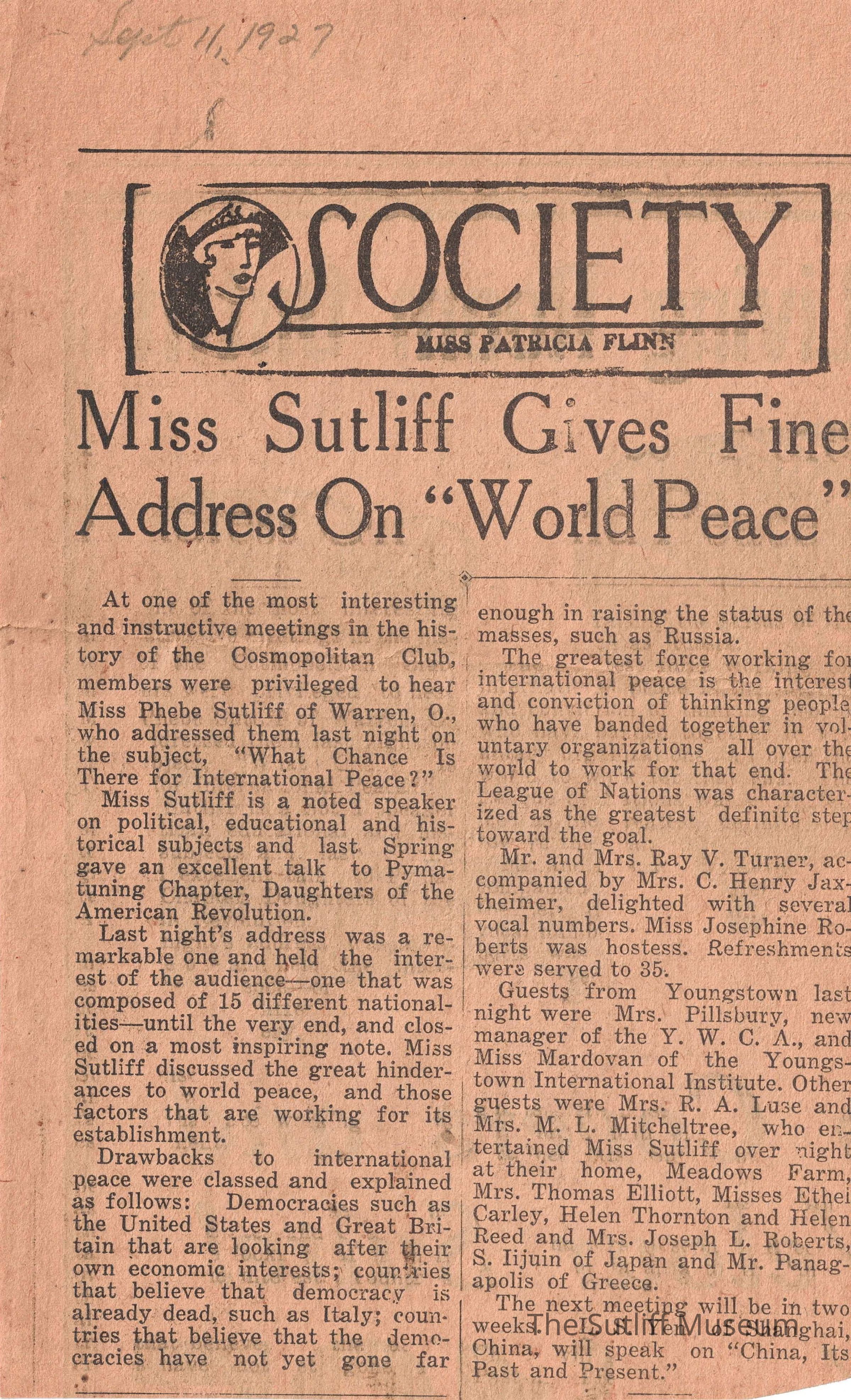 Newspaper article, "Miss Sutliff Gives Fine Address On "World Peace""Archive Details