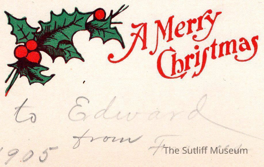 A Christmas gift tag with an image of holly and berries. Tag is addressed to Edward from Frances, dated 1905.Relationships