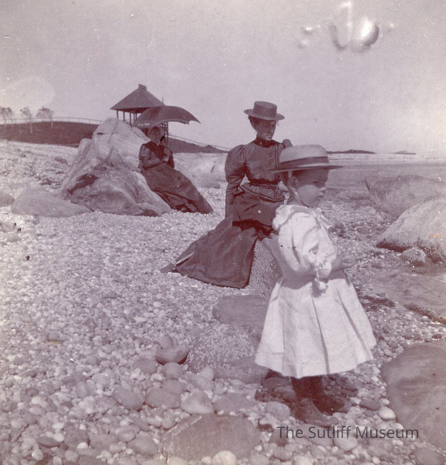 Photo of Edward Sutliff Brainard as a child playing in the water on the shore of a lake or ocean. He is wearing a round sunhat with a white gown and leather boots. His mother, Lydia Sutliff Brainard is seated behind him on a rock. Another woman is seated on a rock in the background with an umbrella, possibly Phebe L. Marvin Sutliff. Photo is dated approximately around 1899-1900.Relationships