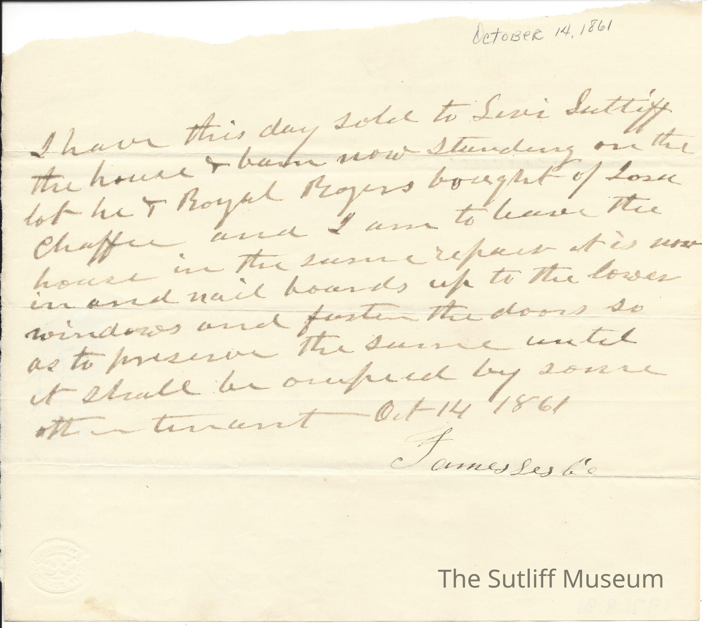 An agreement between Levi Sutliff and James Leslie regarding Leslie selling his land to Sutliff.Collection