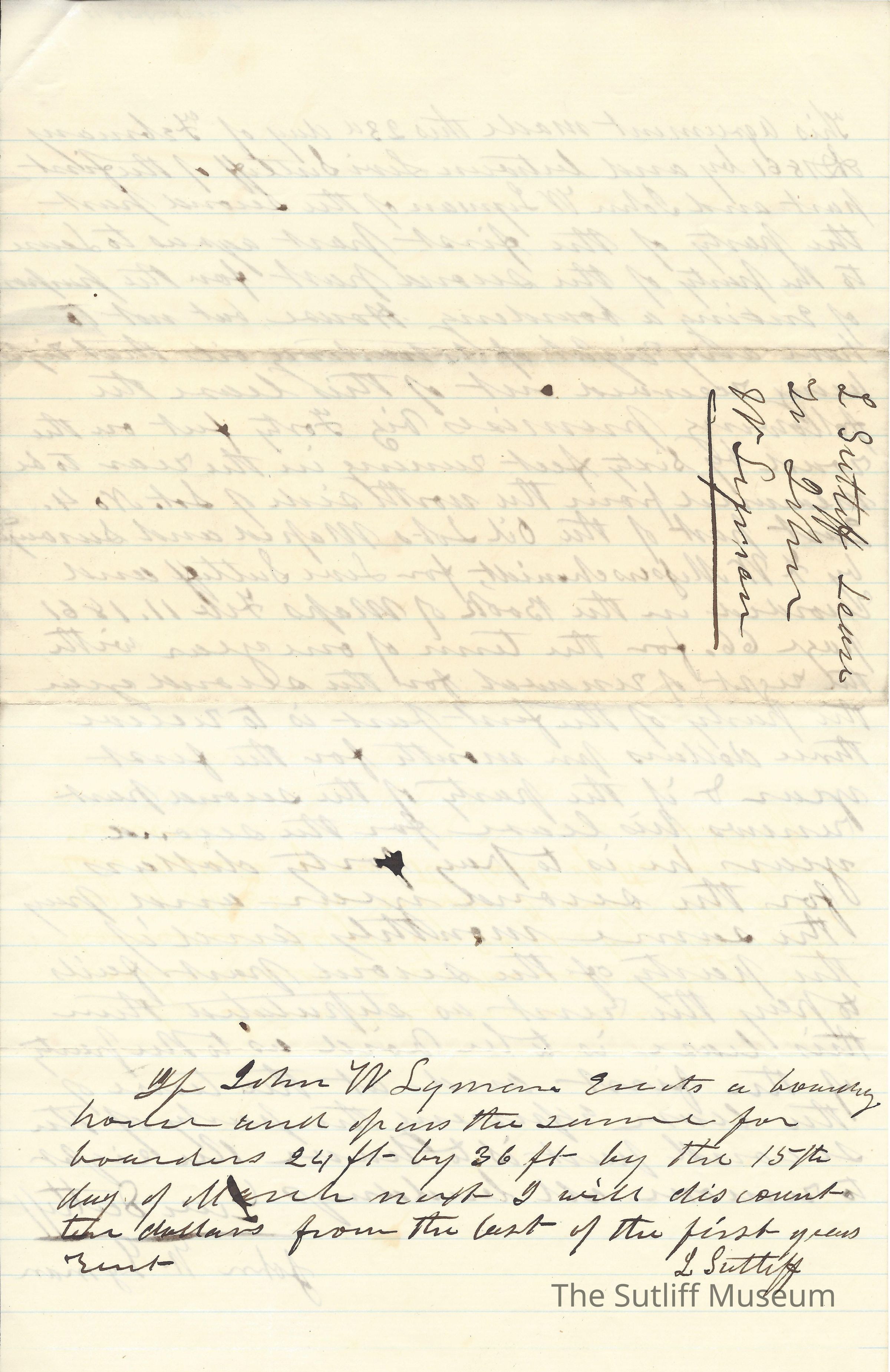 An agreement between Levi Sutliff and John W. Lyman regarding a lease to land to build a boarding house and payment.Collection