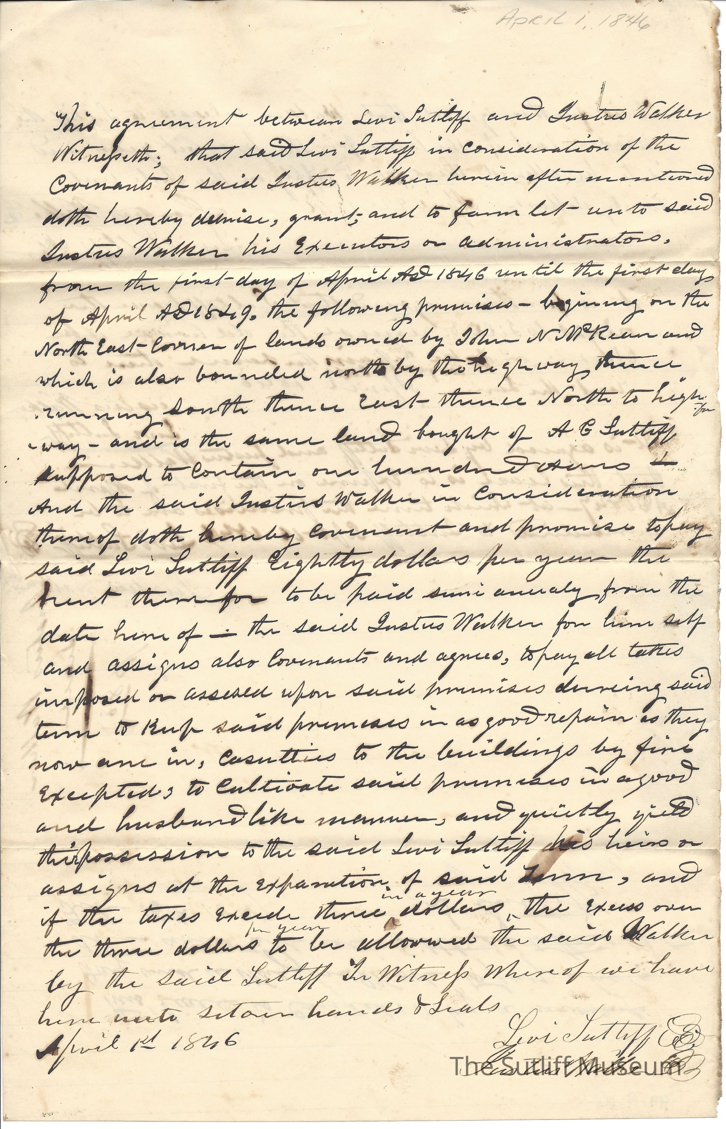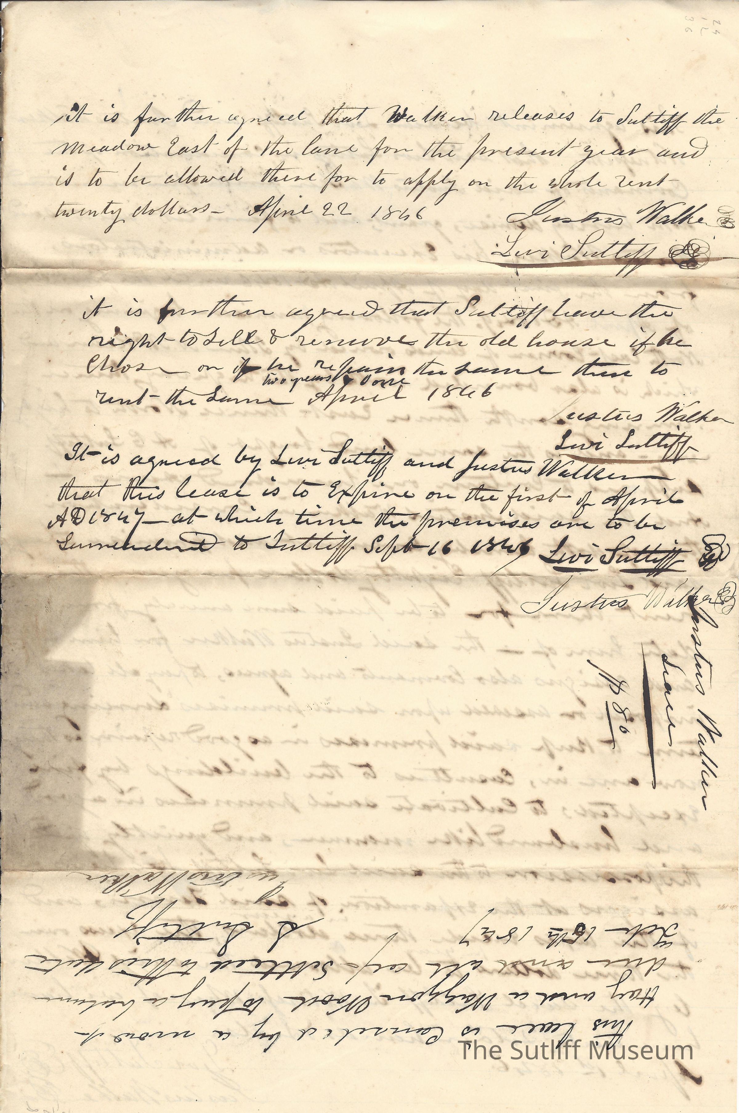 A letter between Levi Sutliff and Justus Walker acting as an agreement about land for rent. It includes amendments and rules for the terms of the lease of land.Collection