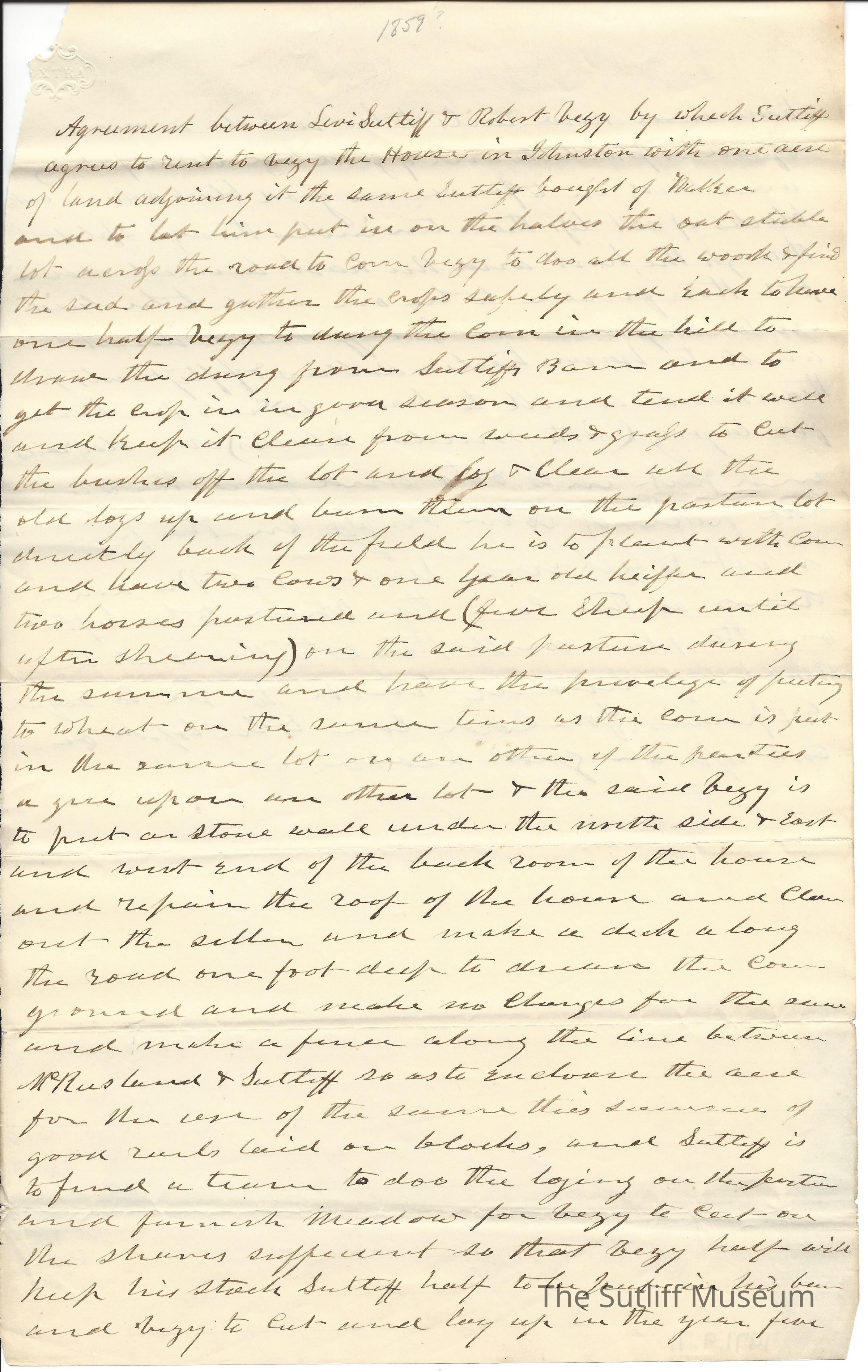 An agreement between Robert Very and Levi Sutliff regarding rent of the Very House and use of the land.Collection