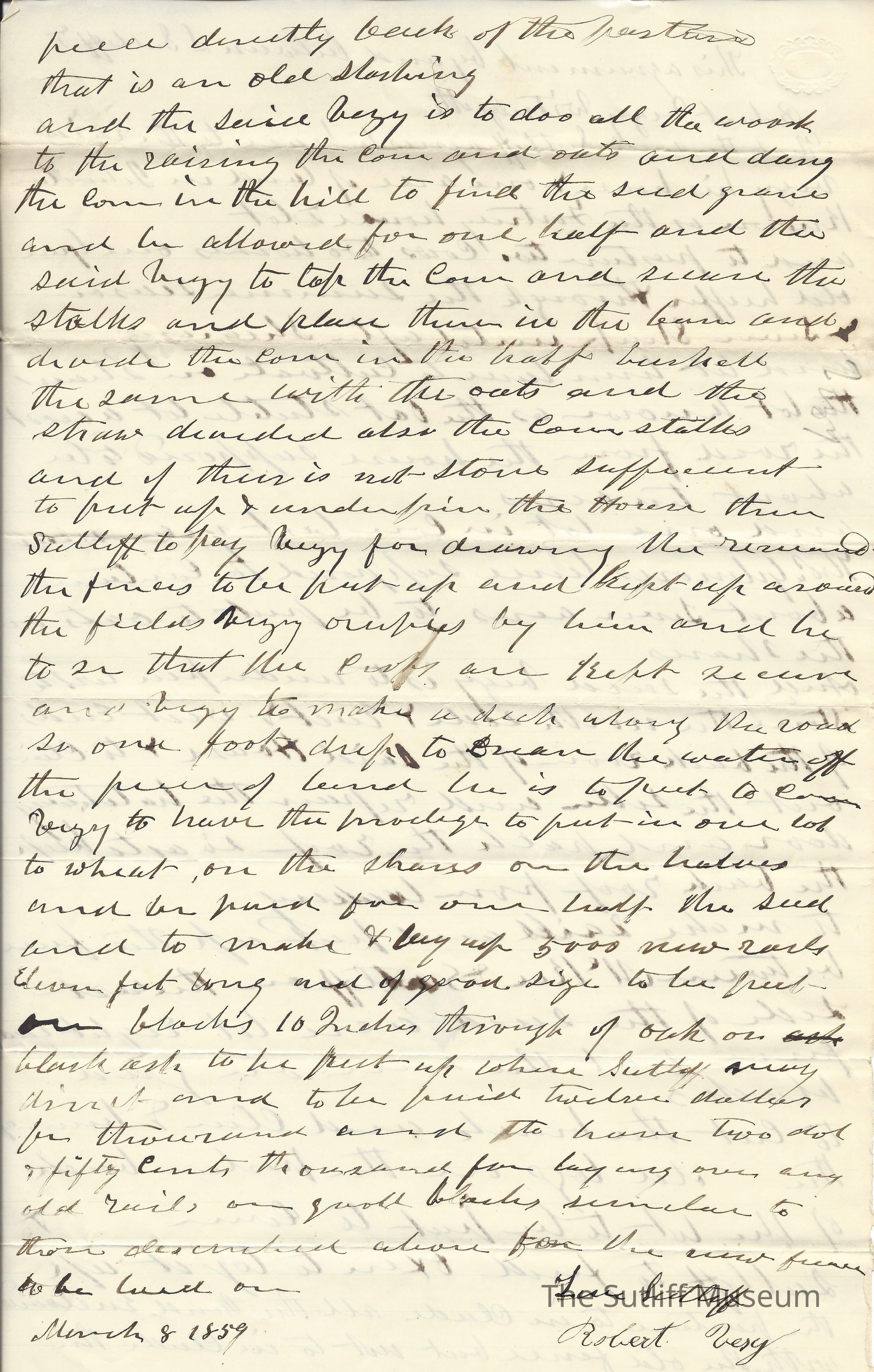 A letter acting as an agreement between Levi Sutliff and Robert Very regarding farm animals, land, corn etc. having to do with business between the two men.Collection