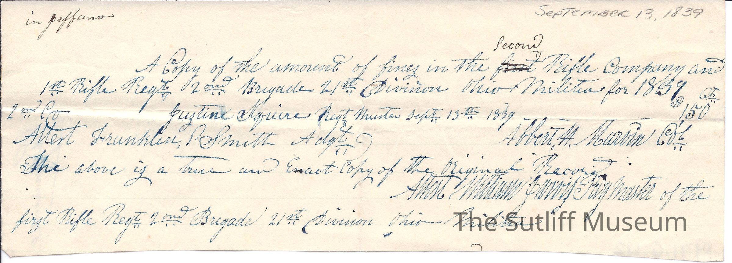 A record of fines imposed by a regiment of the Ohio Militia from Albert William Jarvis to Flavel Sutliff.