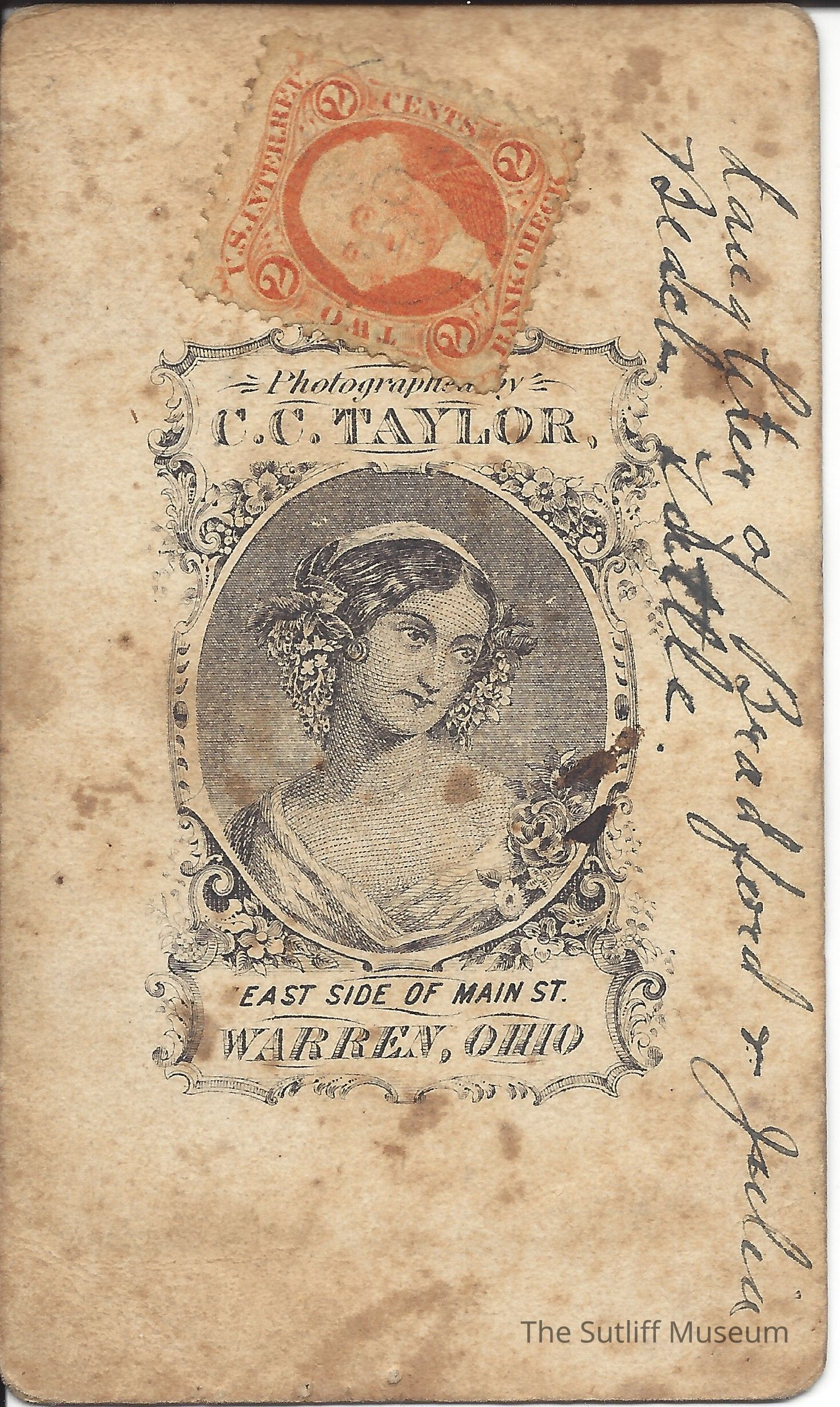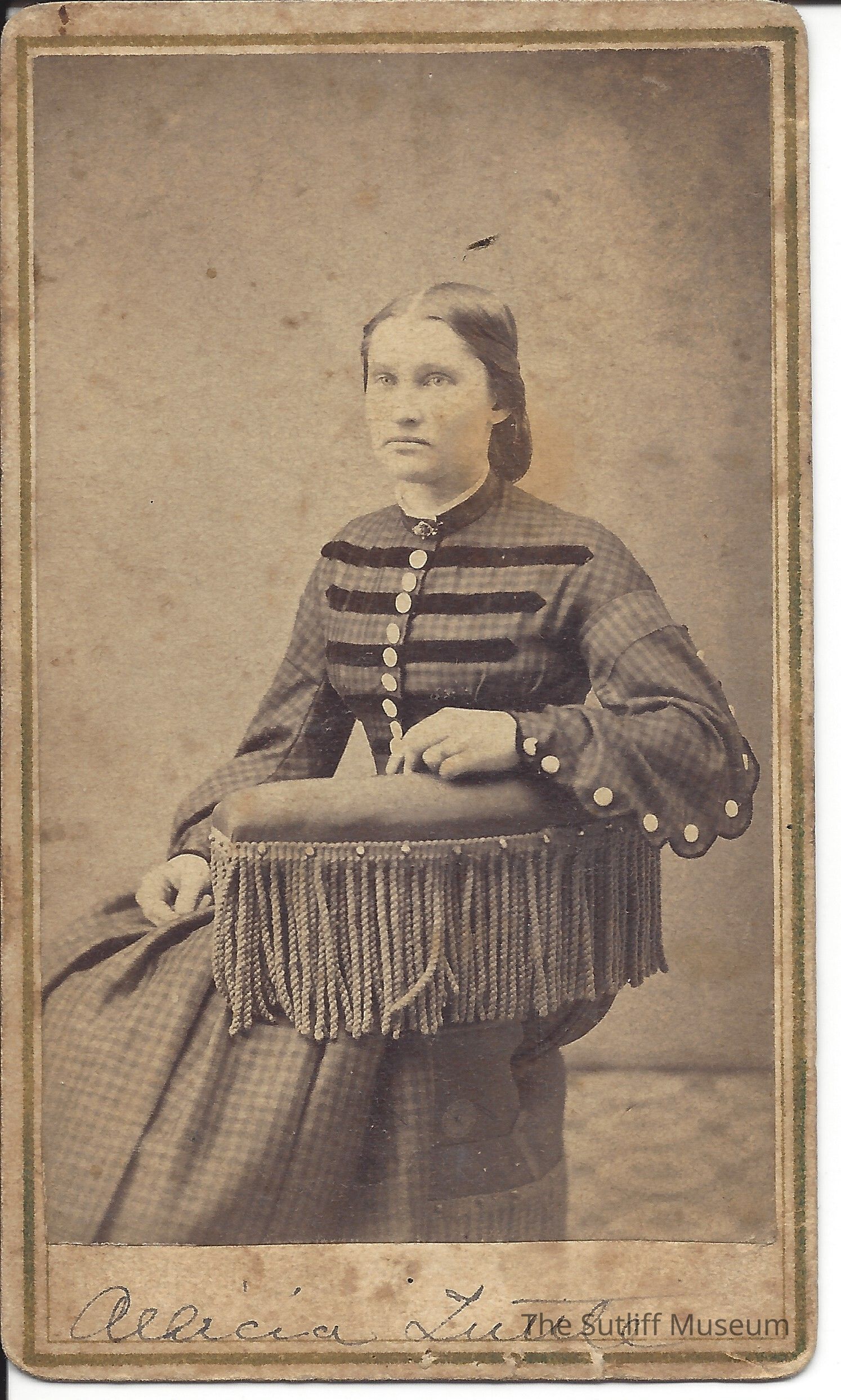 Photograph of Alicia Tuttle, seated with a gingham dress and brass buttons. Back of photograph has a 2cent stamp, writing "daughter of Bradford & Julia Beach Tuttle" and the maker's markCollection