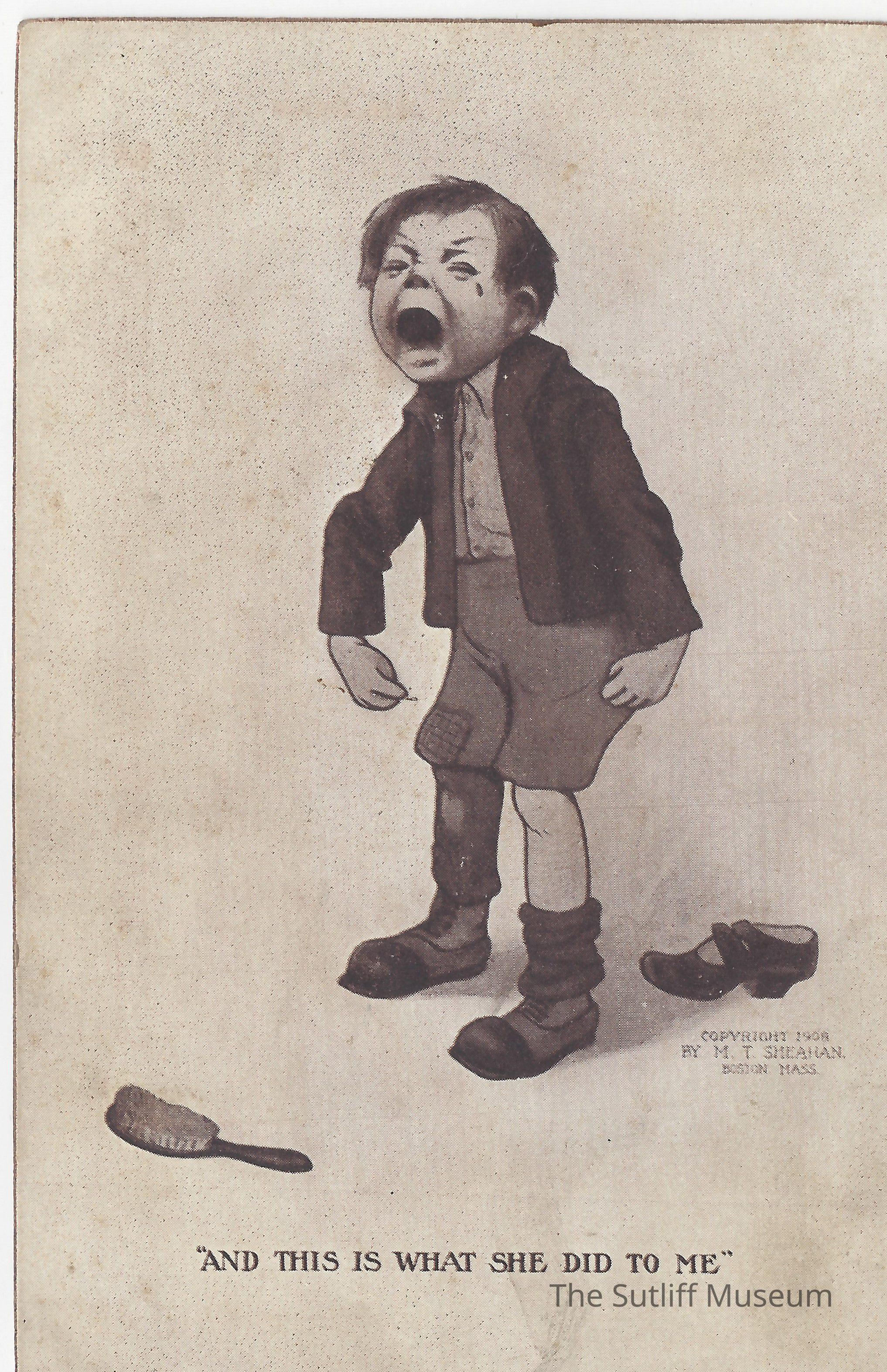A postcard depicting a boy crying with the saying "And This Is What She Did To Me". Sent January 28, 1909.