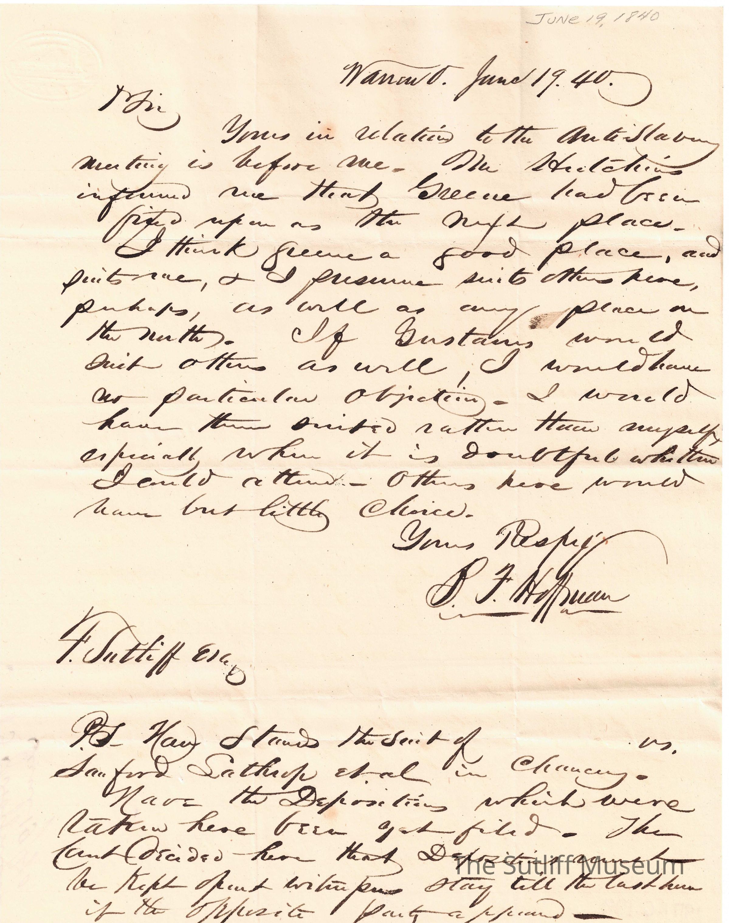 Letter from to B.F. Hoffman to Flavel Sutliff regarding an anti-slavery meeting.Collection