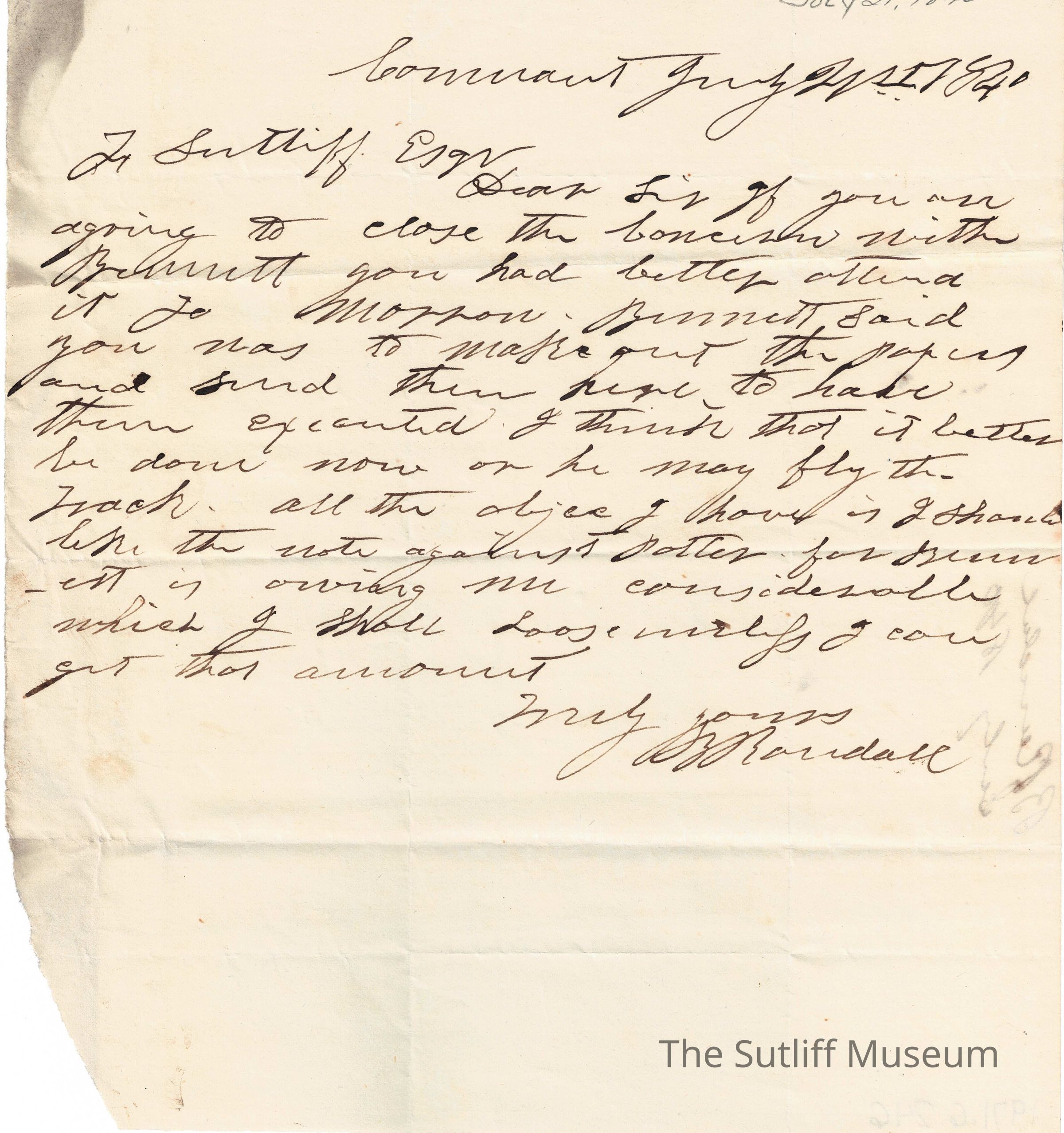 Letter from Brewster Randall to Flavel Sutliff regarding [?]