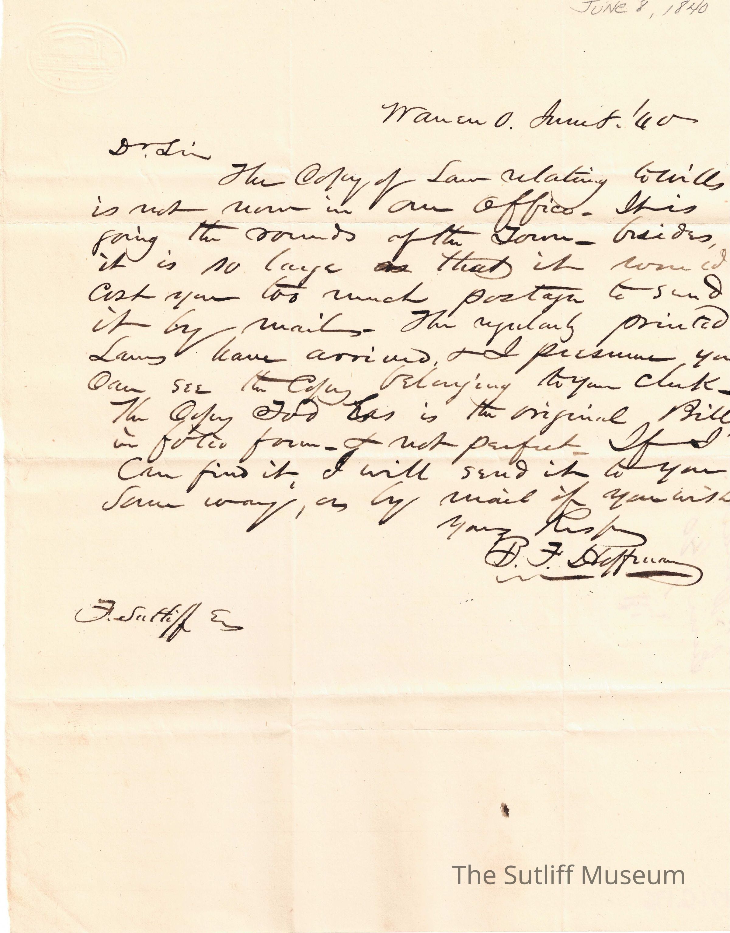 Letter from B.F. Hoffman to Flavel Sutliff regarding payment for legal services.