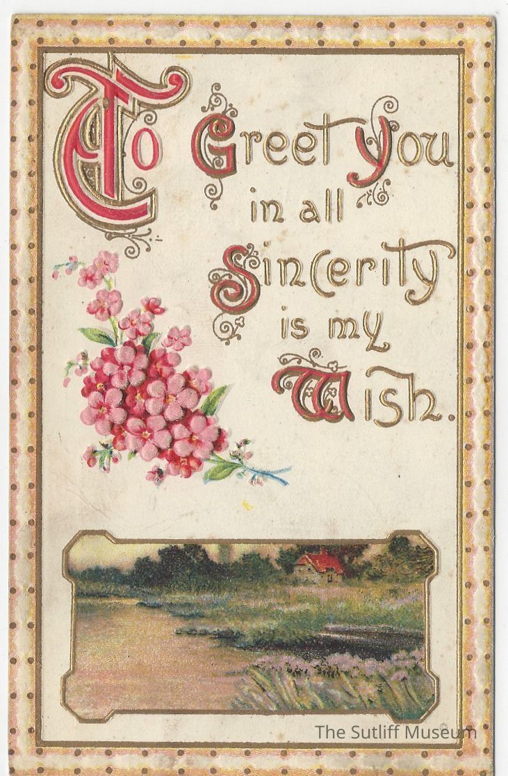 A postcard with the phrase "To Greet You in all Sincerity is my Wish" with a small landscape image underneath.