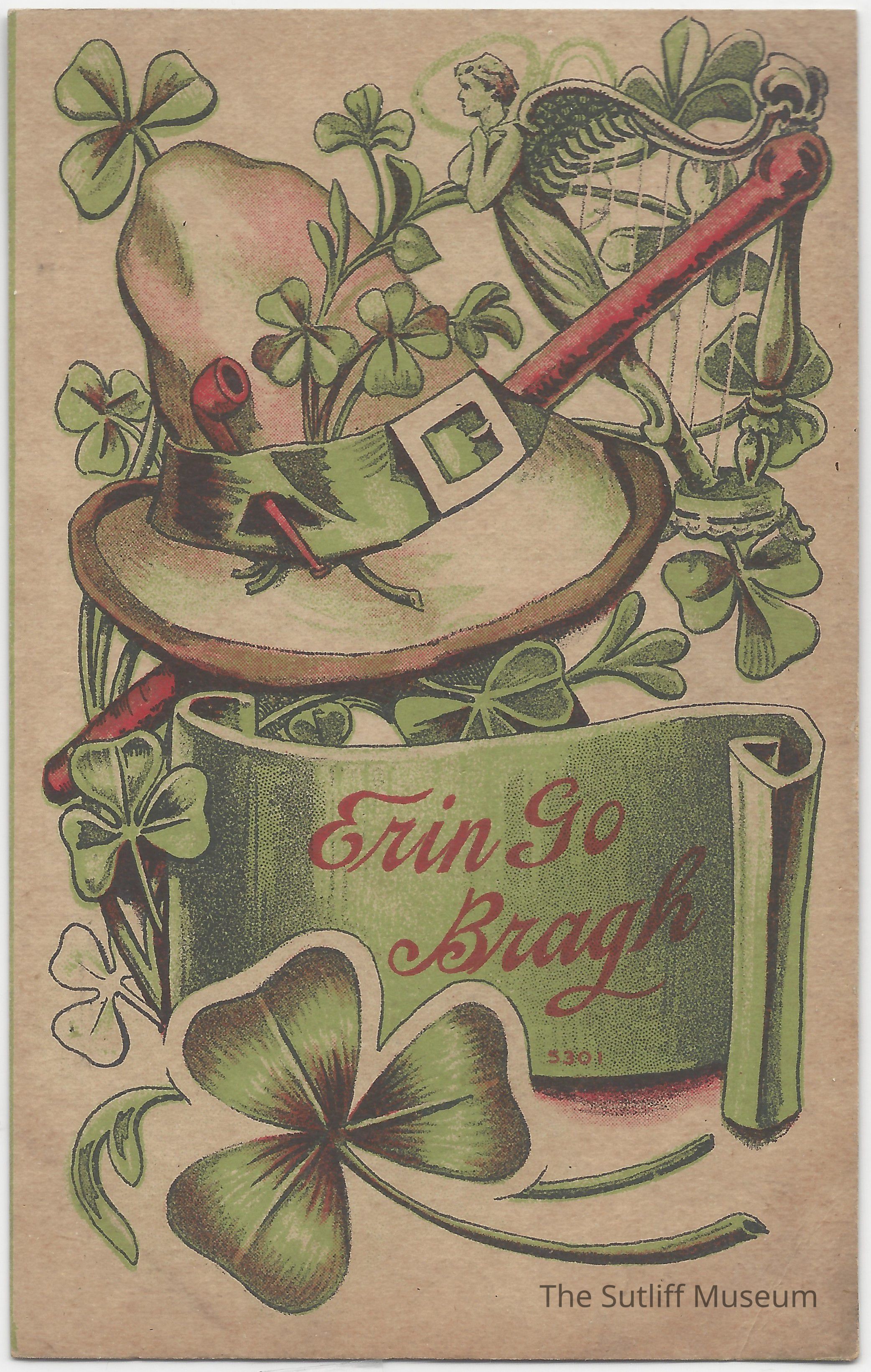 St. Patrick's Day postcard depicting a leprechaun hat, a green harp, and a sign that says "Erin Go Bragh". Also many three-leafed clovers.
