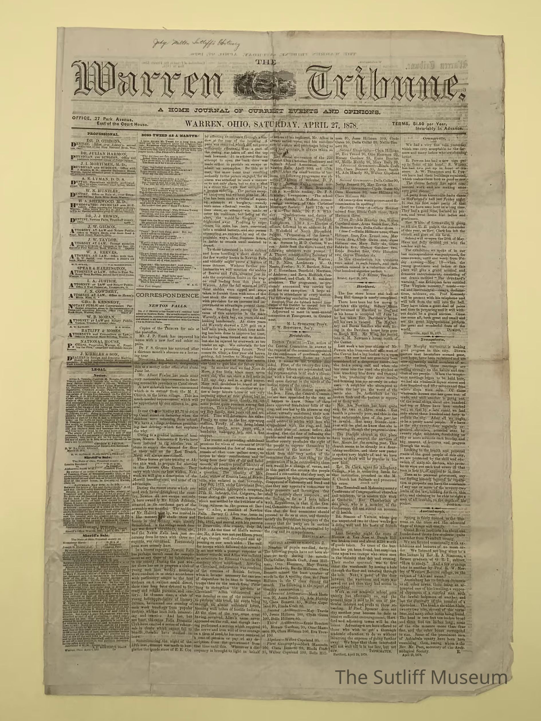 The Warren Tribune published on April 27, 1878. This edition contains the obituary for Milton Sutliff.Collection