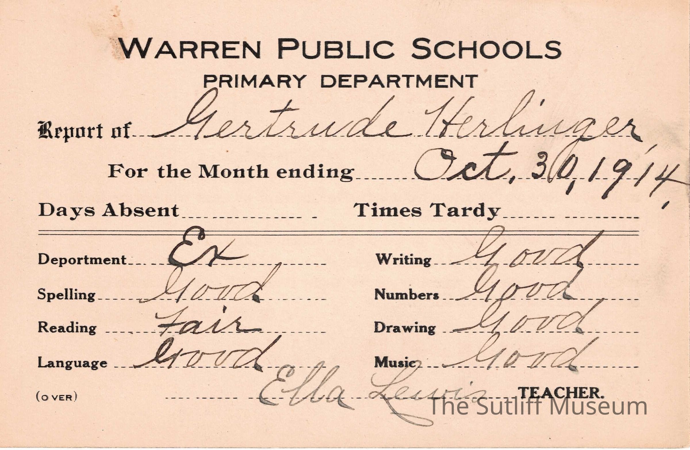 A set of four report cards for Gertrude Herlinger from the Warren Public School system. They are signed by teacher Ella Lewis. The first report card is dated September 29, 1914, the second is dated October 30, 1914, the third is dated November 30, 1914, and the last is dated December 29, 1914.Collection