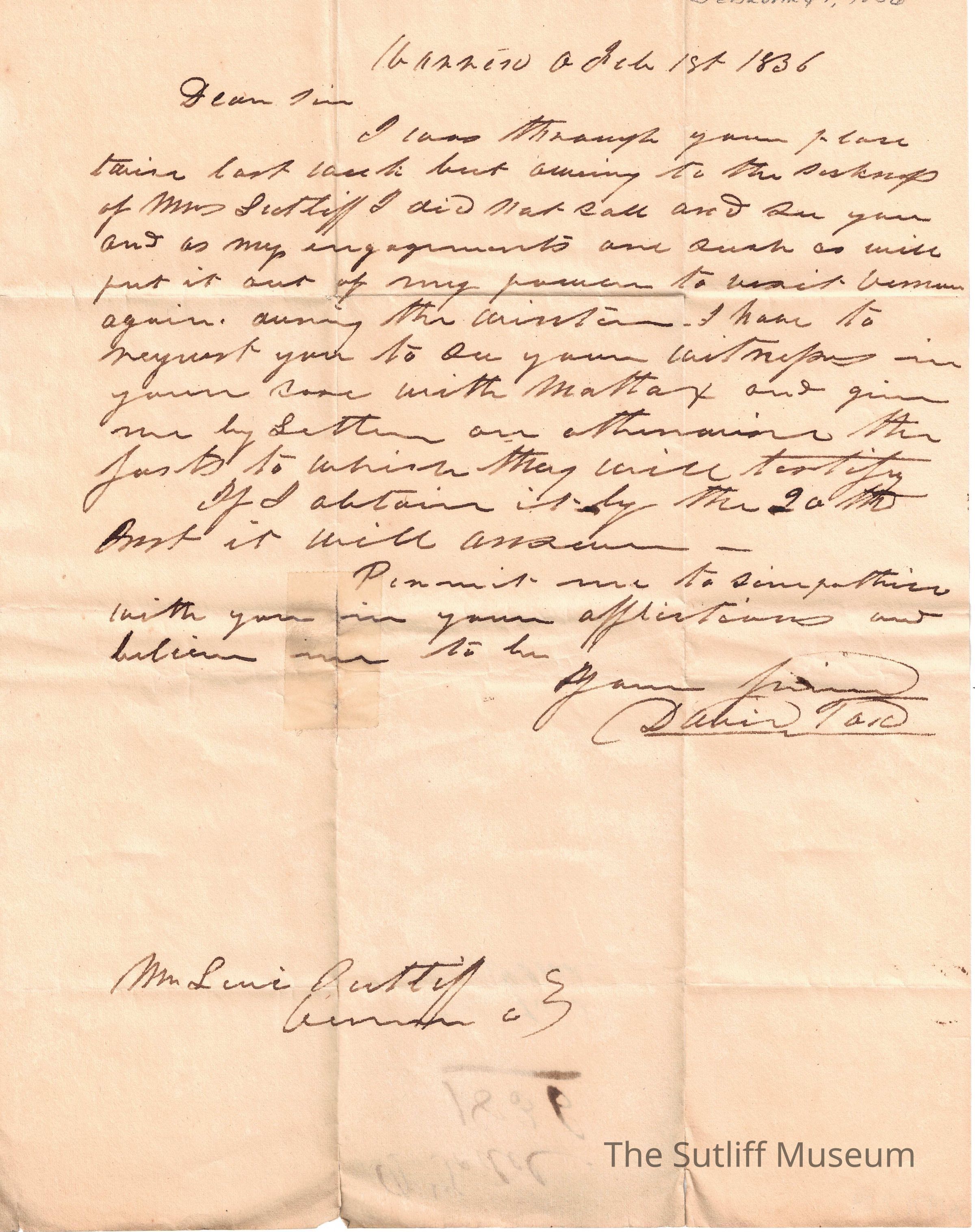 A letter from David Todd to Levi Sutliff regarding a wish to visit him for business.