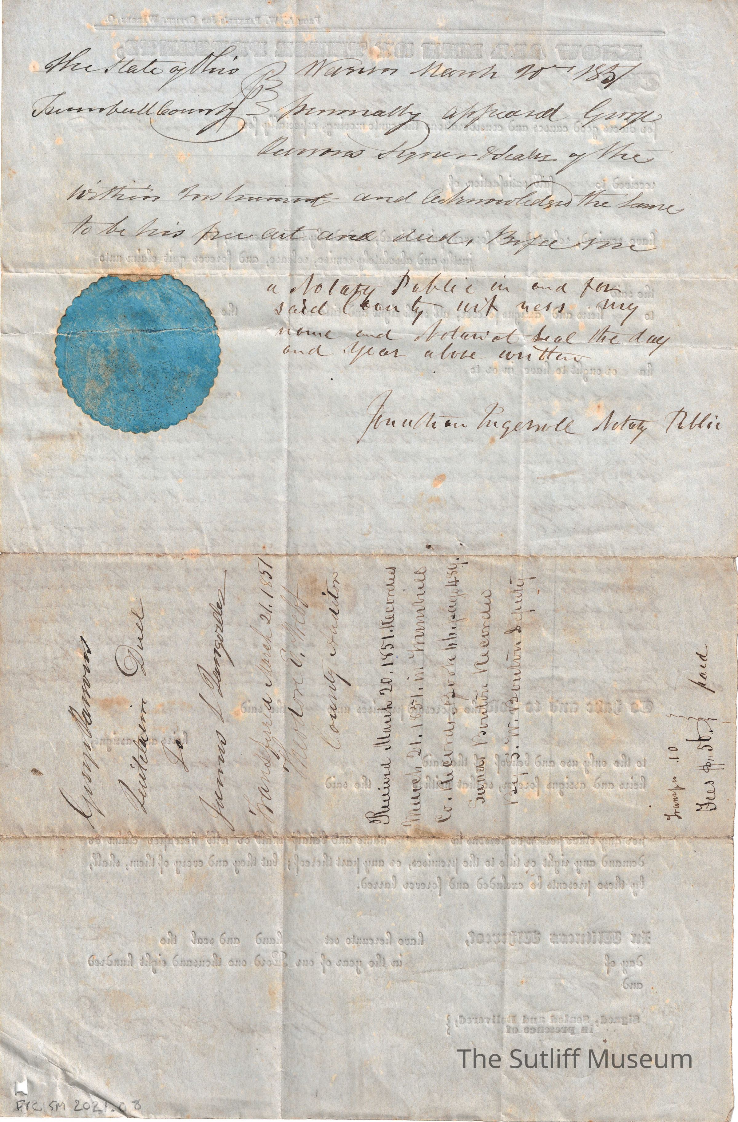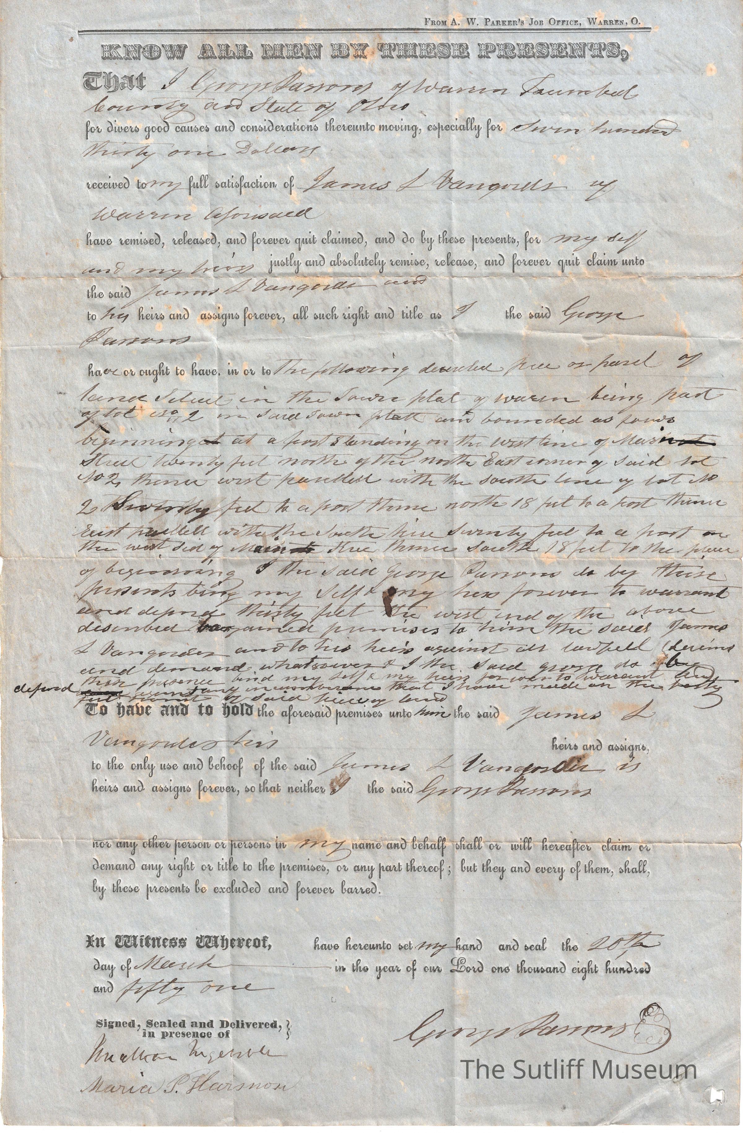 A legal document regarding the deed of land from George Barrons to James L. [Vangords]Relationships