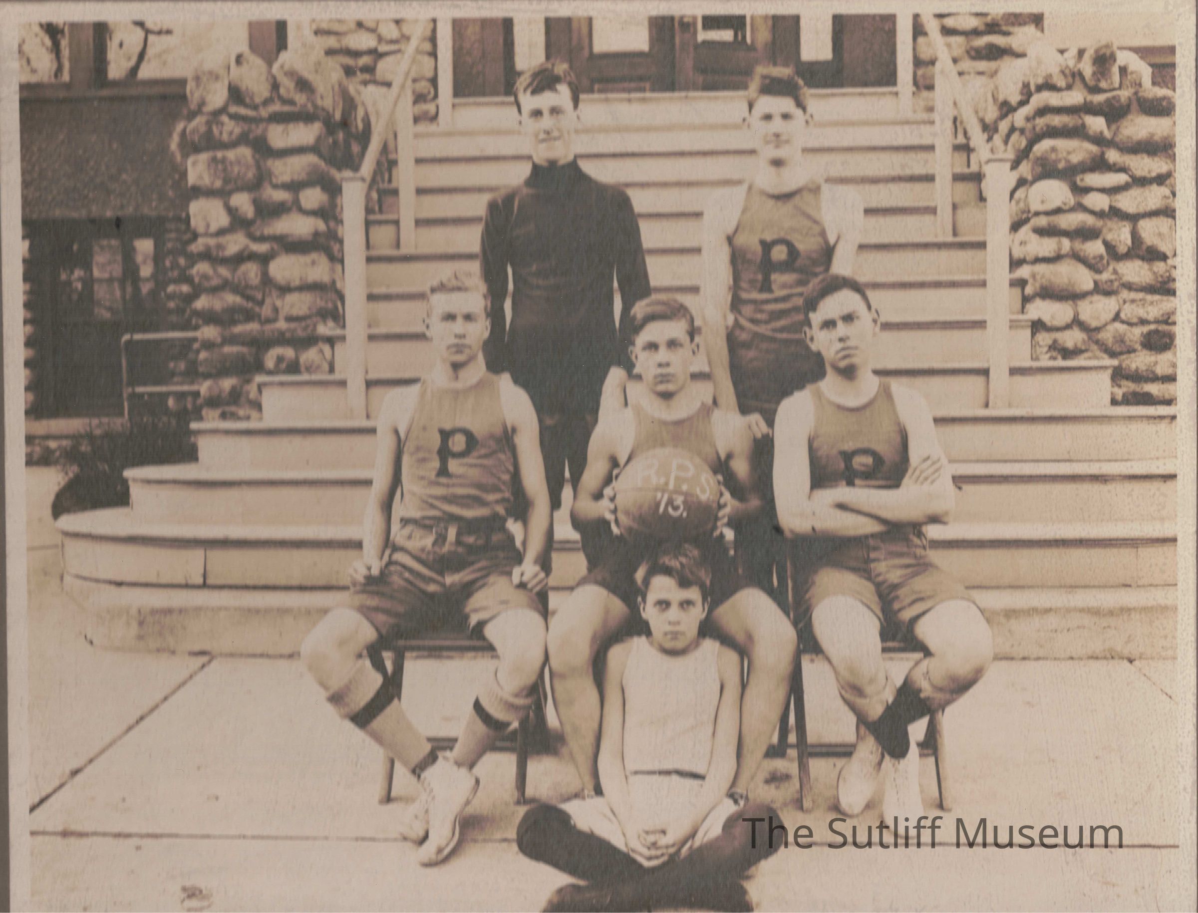 The sepia photograph shows Edward Brainard Sutliff and his basketball team at Ridgewood Preparatory in November of 1912. Robert Harris and Robert Lee are in the top row. Iver Renway, Edgiton Pattison, and Edward Brainard are in the second row. Dan Pattison is in the bottom row.
