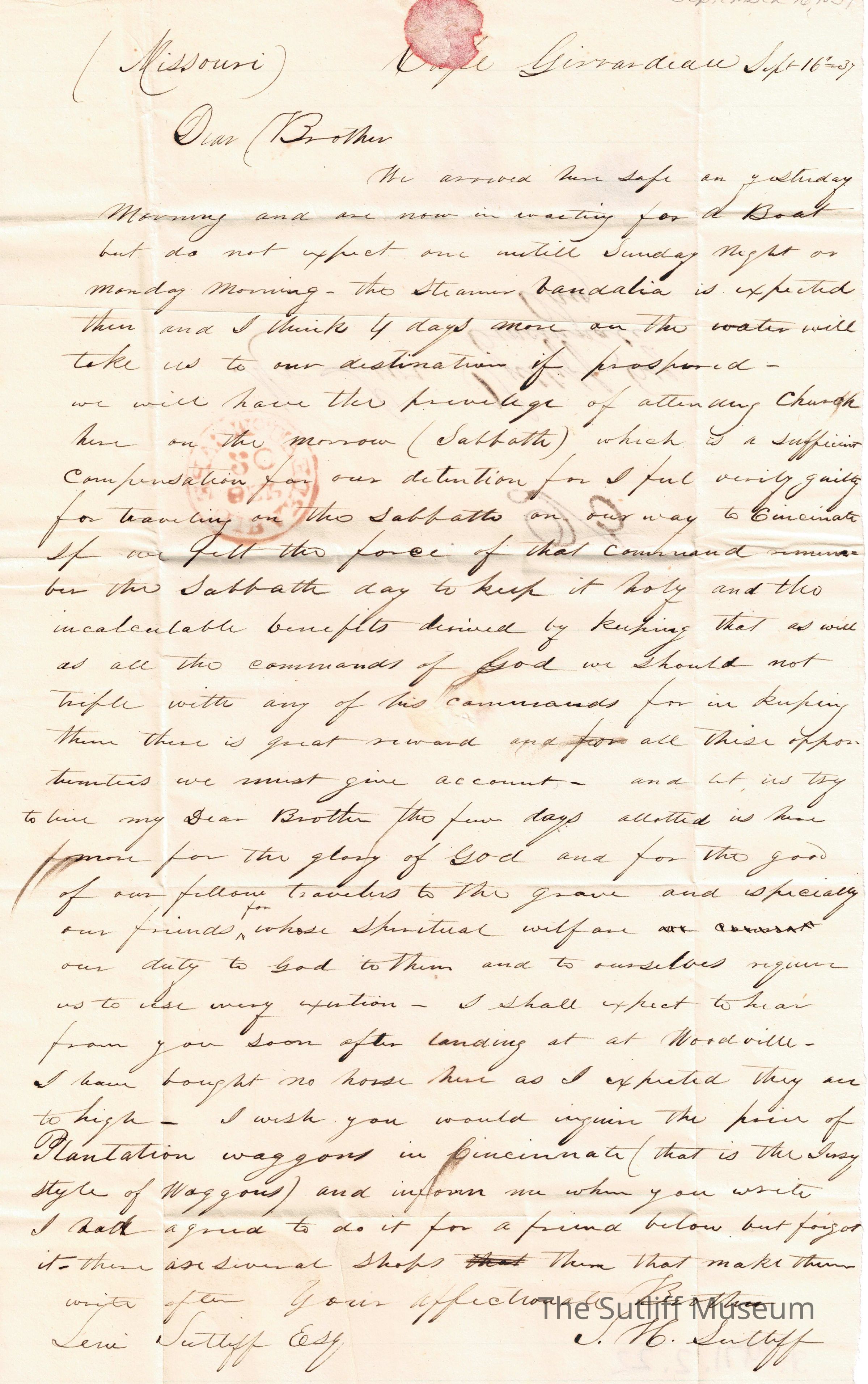 Samuel Sutliff writes to Levi Sutliff about traveling from Missouri to Cinncinati and his guilt of traveling on the Sabbath.Collection