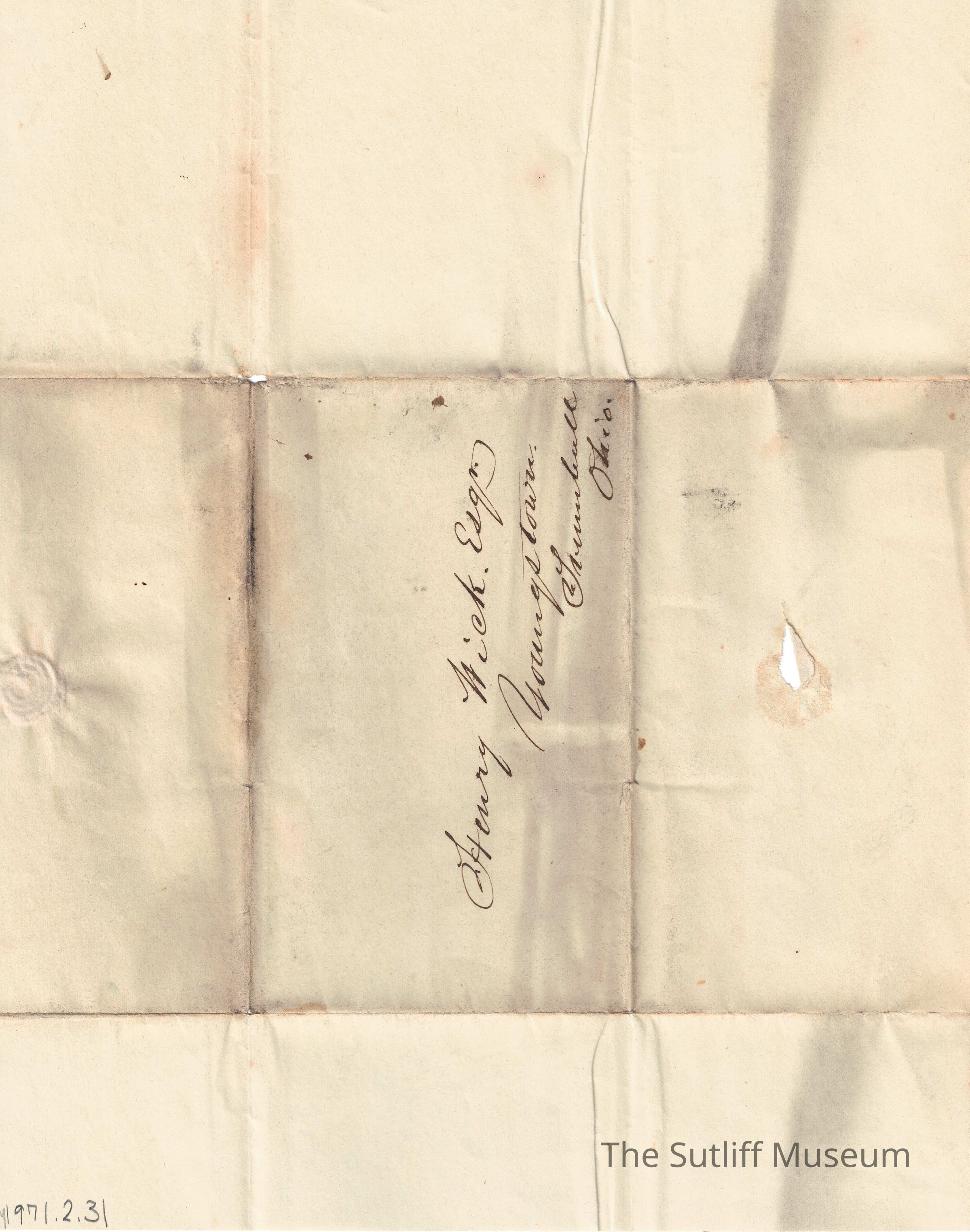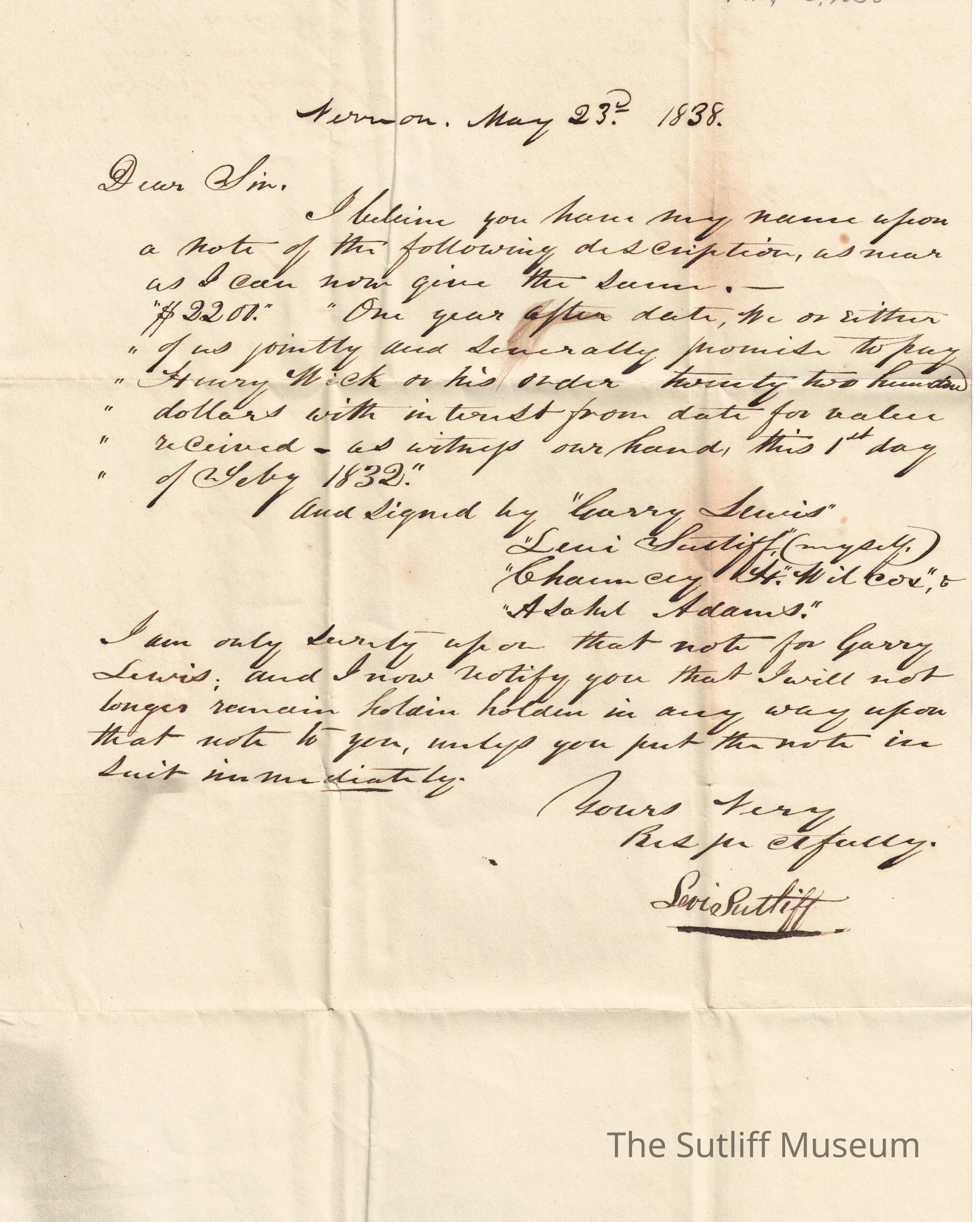 A letter from Levi Sutliff to Henry Wick, Esqr. regarding Sutliff and Garry Lewis no longer holding in any way to a note that promises to pay Wick $2200 along with Chauncey H Wilcox and Asahel Adams.Collection
