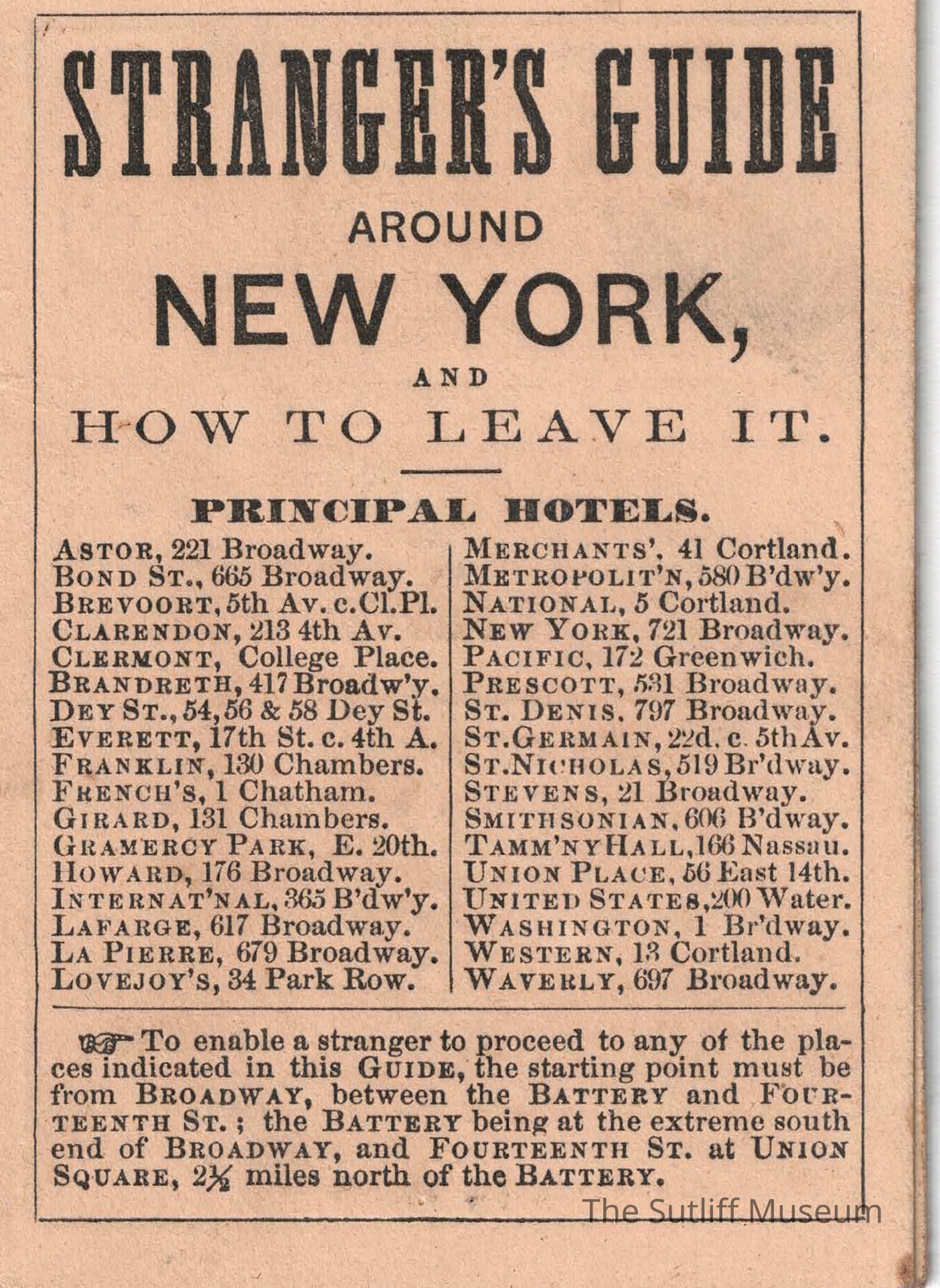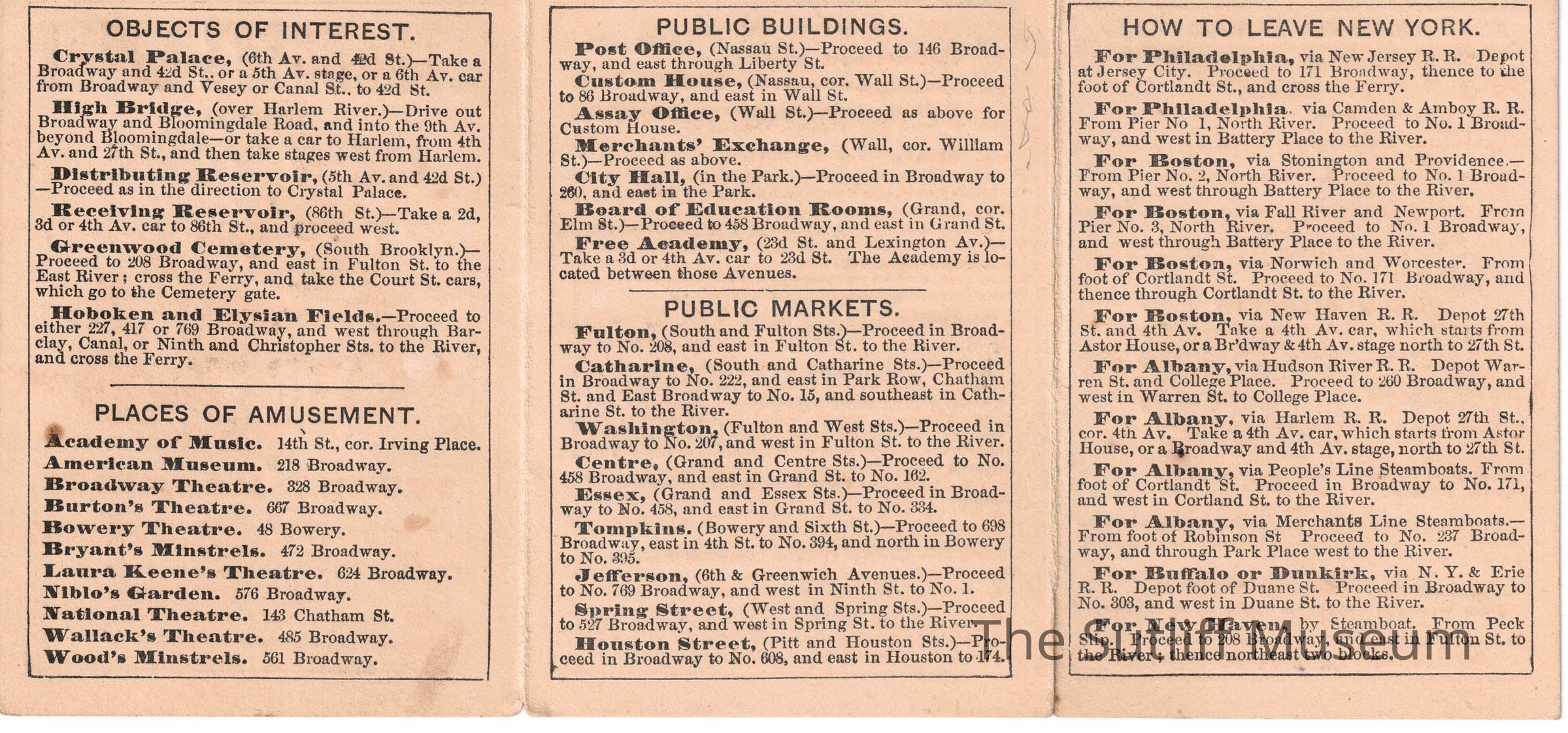 A guide book for New York including hotels, objects of interest, places of amusement, public buildings, public markets, and how to leave depending on which direction you are looking to go.