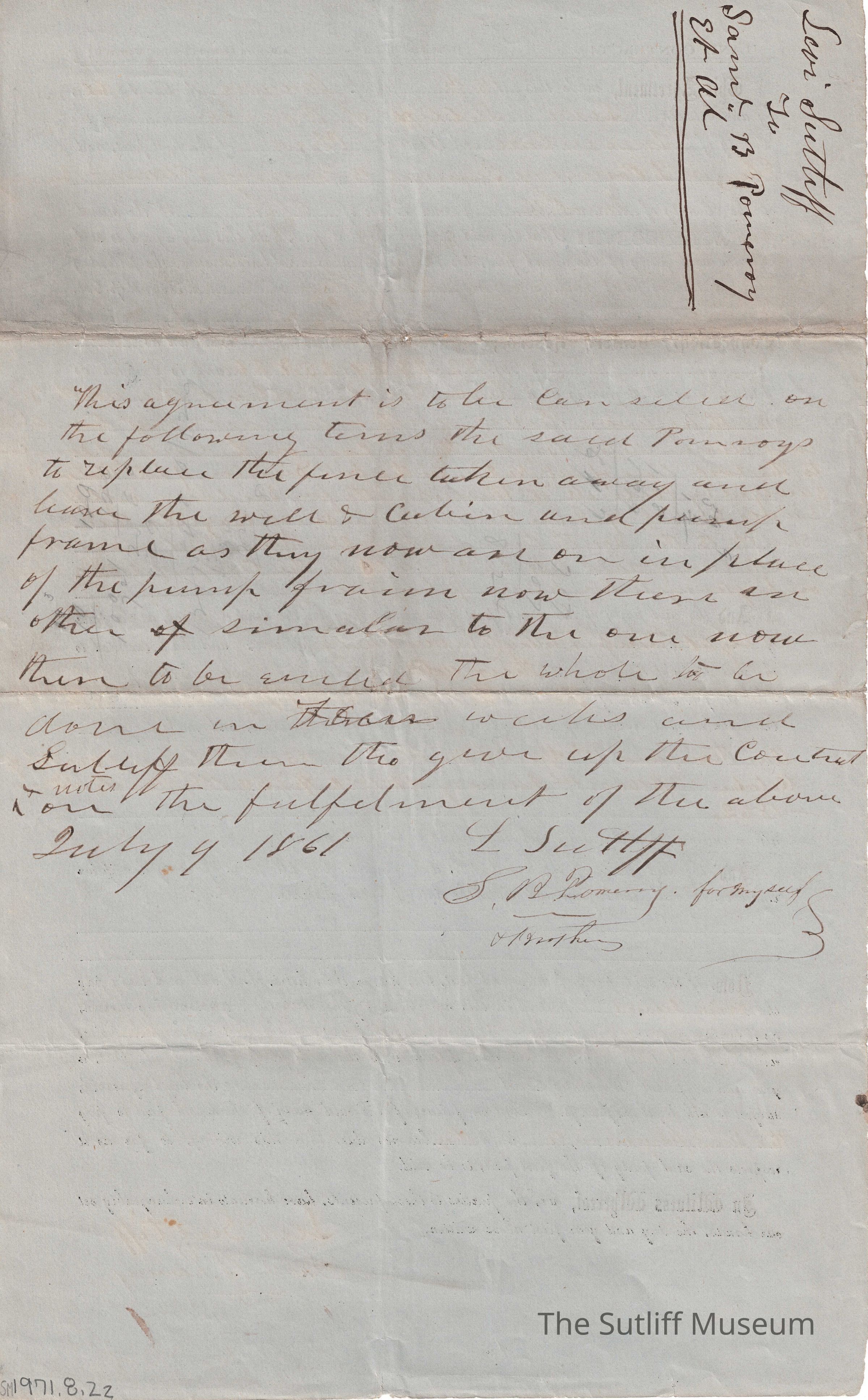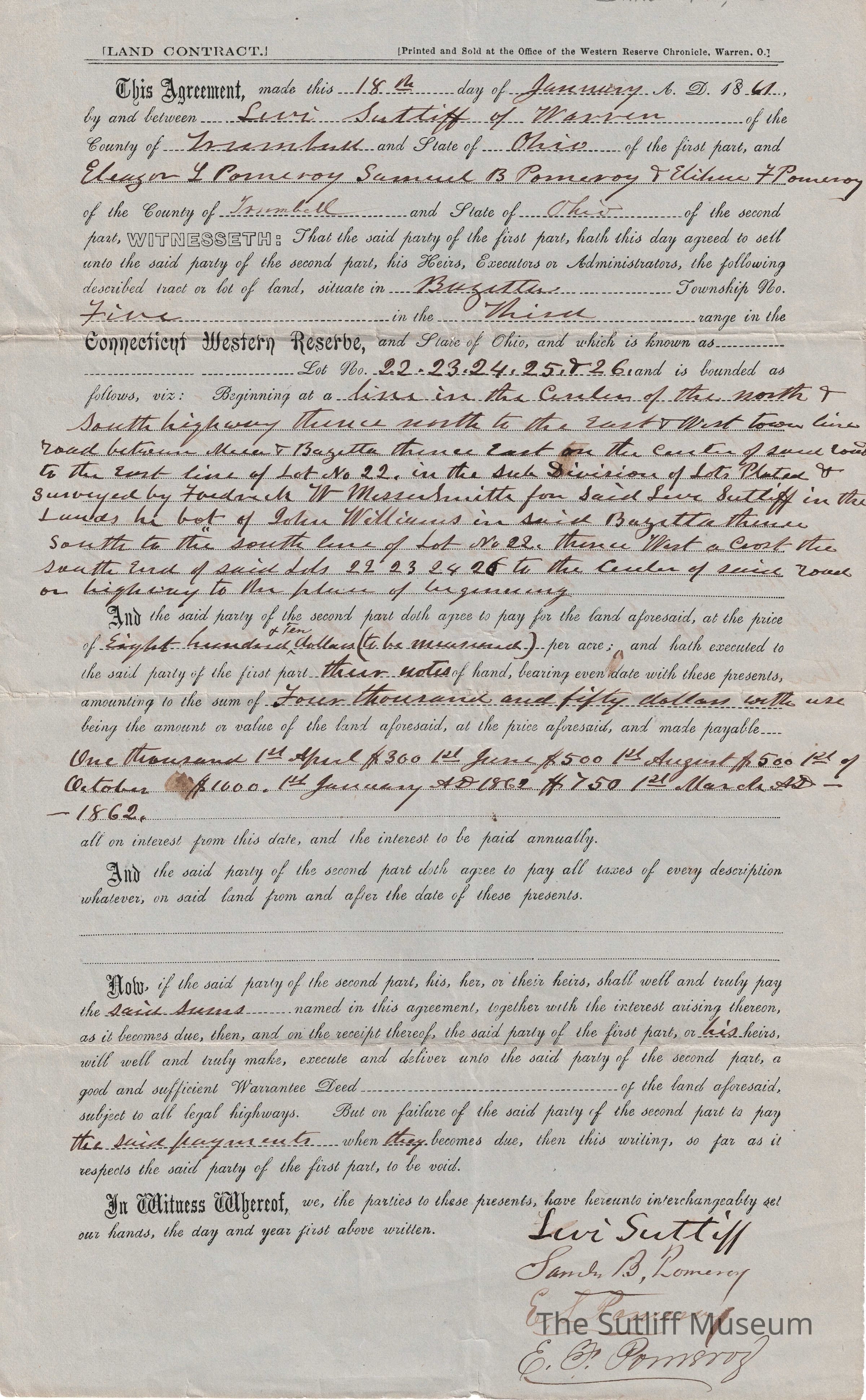 A land contract between Levi Sutliff and Samuel, [Elenor], and [Elibee] Pomeroy.Relationships