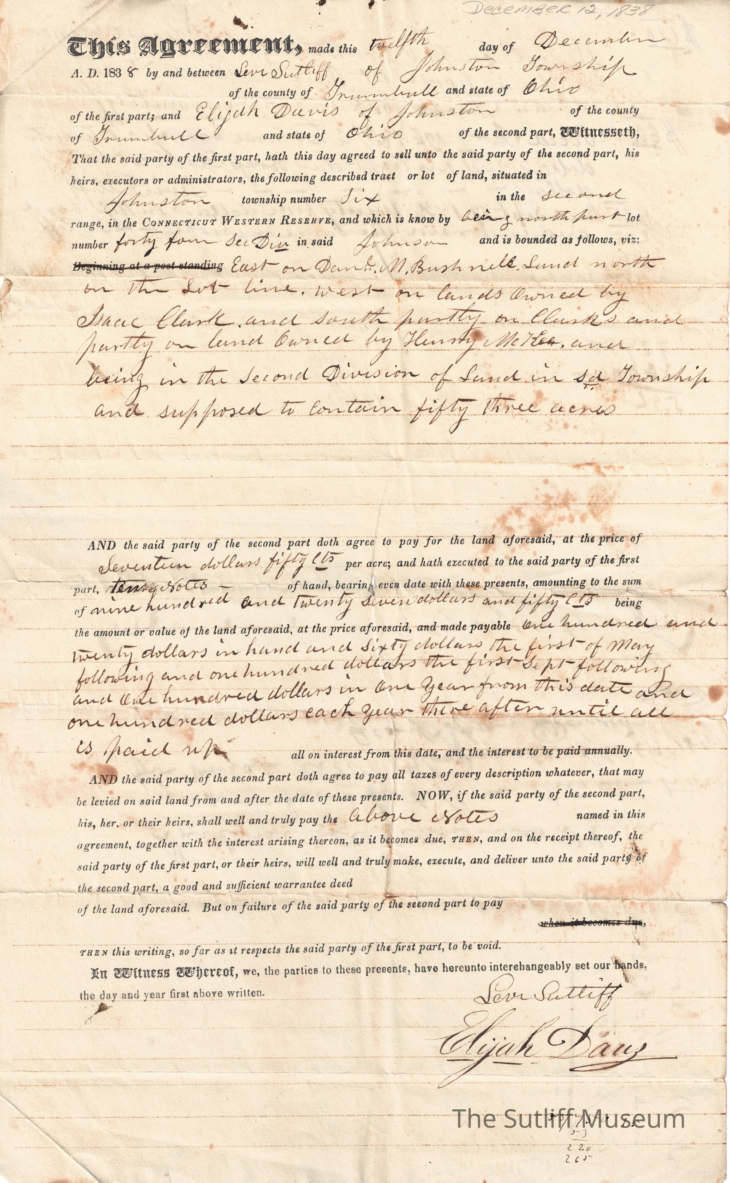 A contract between Levi Sutliff and Elijah Davis for land in Johnston township for the price of $17.50 per acre for the sum of $927.50. The payment plan is set with Davis paying $120 and $60 by May 1, $100 by Septemper 1, $100 a year from the above date, and $100 each year following until paid in full.Collection